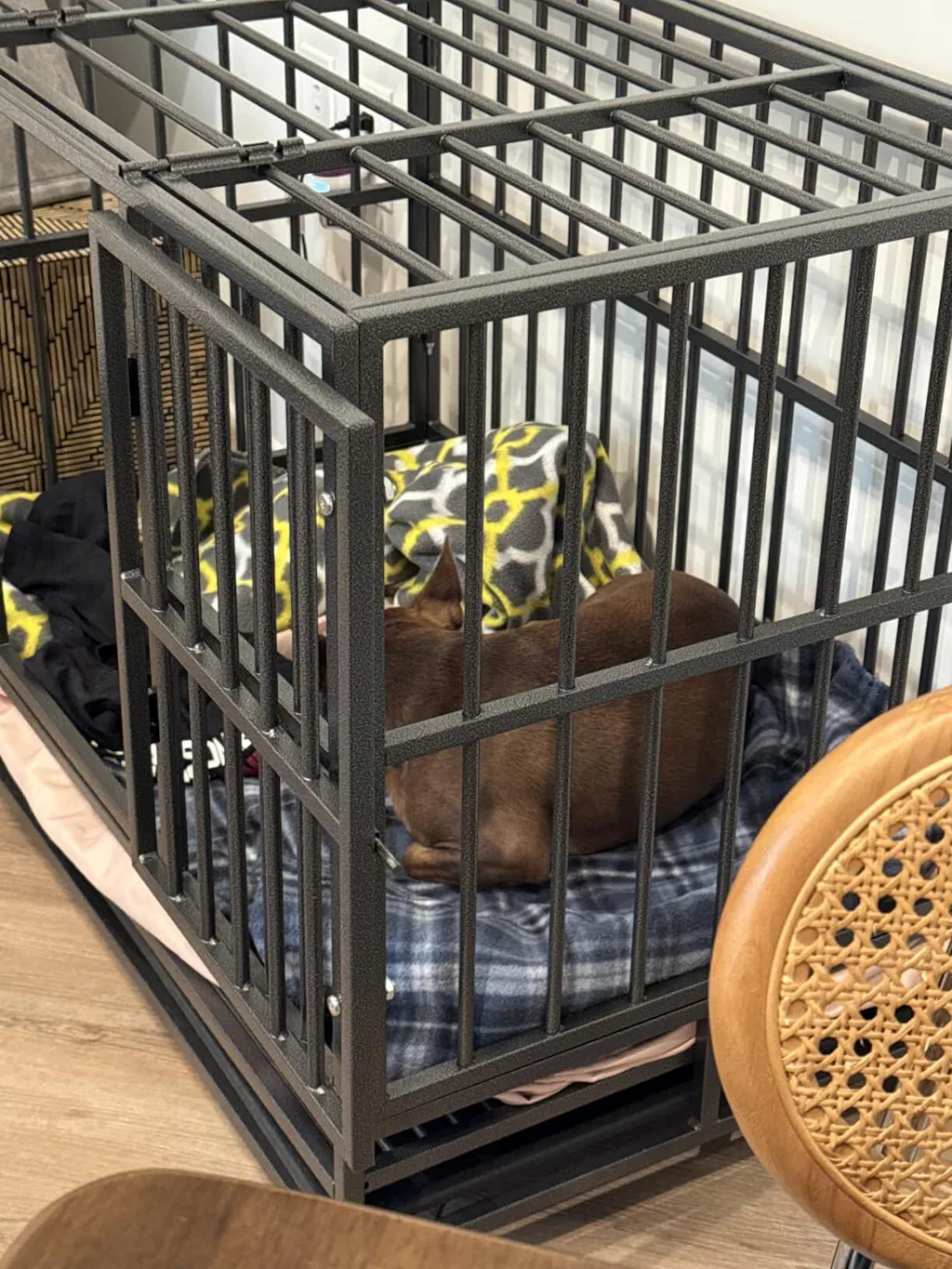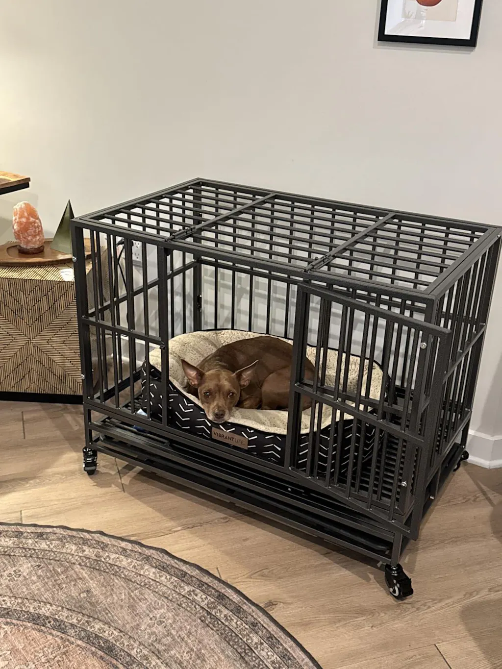 Our 45-inch heavy duty dog crate is expertly crafted from reinforced steel pipes, offering unparalleled strength and durability. Designed specifically for medium to large breeds and high-anxiety dogs, this indestructible crate is escape-proof and chew-resistant, ensuring your pet stays secure and comfortable indoors.