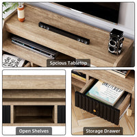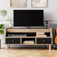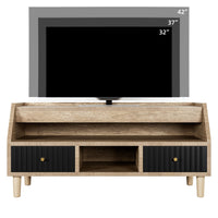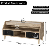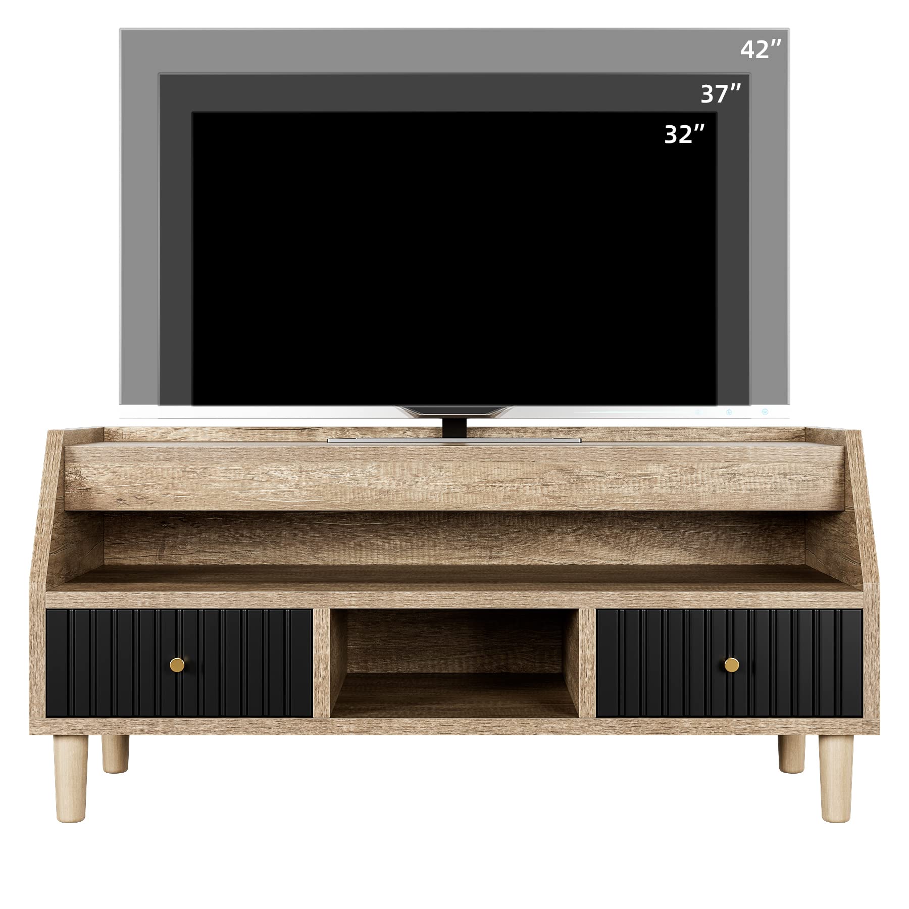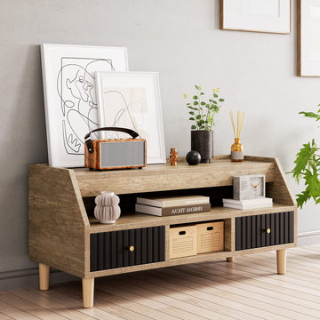 Two spacious drawers and open shelves provide versatile storage options for all your entertainment essentials.