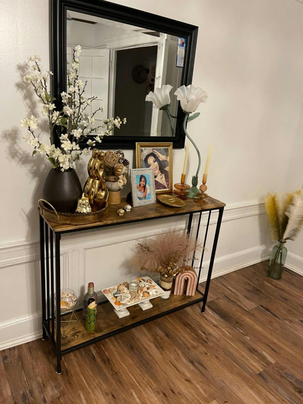 - ✓ EXTRA STORAGE SPACE: This gold sofa table with open shelf is a versatile foyer table for your entryway. The bottom tier of the 2-tier sofa table provides an ideal spot for additional storage, whether it be for shoes, baskets, or anything else. By fully utilizing the available space, you'll have all your daily essentials easily within reach, ensuring a neat and tidy home or office. The long and skinny shape allows the modern entryway table hidden behind the couch or under the window.