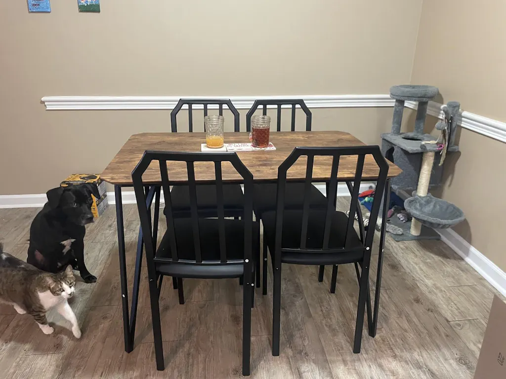 - [Chamfer Design] Experience the innovative Chamfer Design that adds a touch of modern elegance to this stylish small dining table set for 4, perfect for four people dining. The kitchen table set carefully crafted chamfered edges enhance the sleek appearance. The smooth surface is easy to clean, making it resistant to surface oil stains.