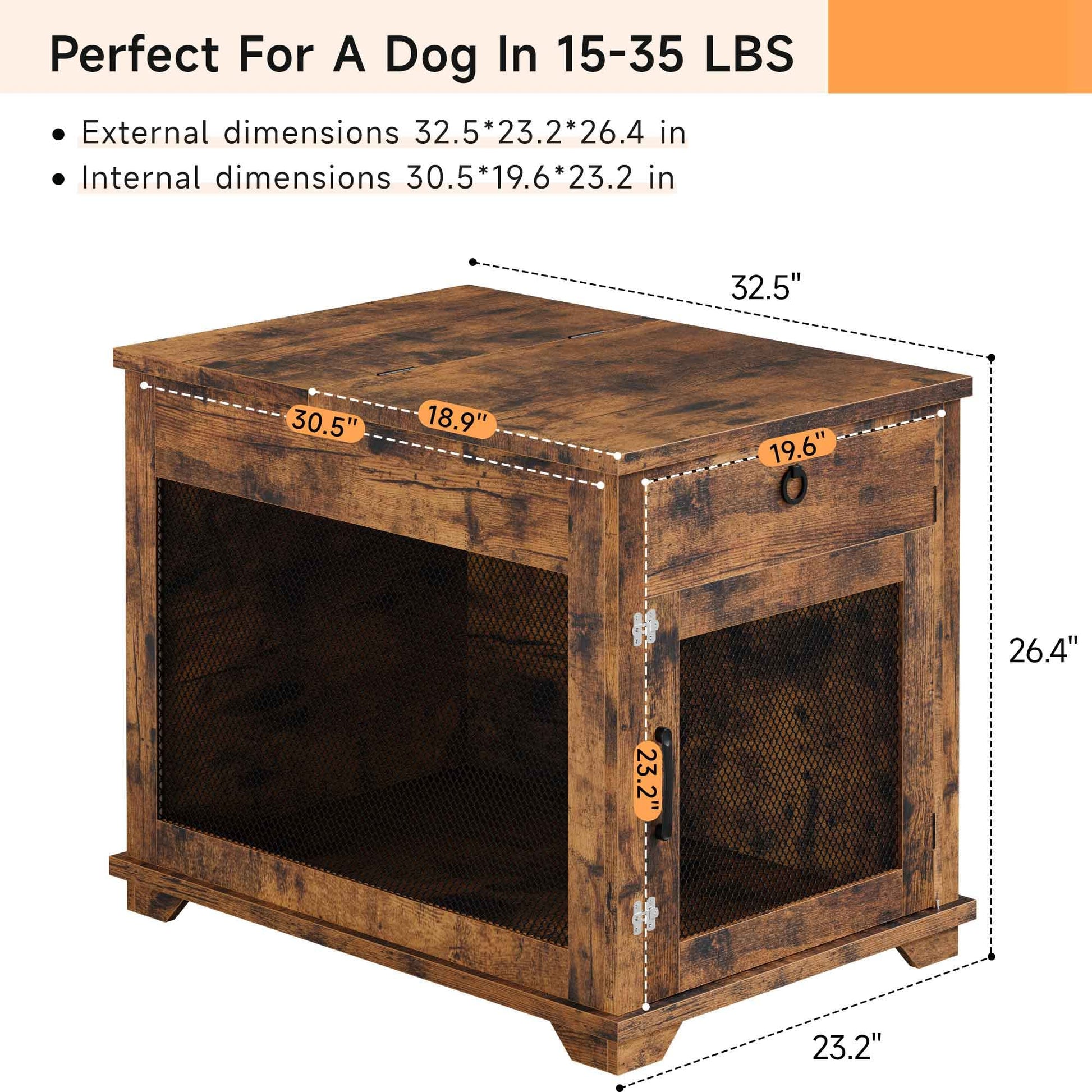Garvee Furniture Style Dog Crate with Pocket Hiding Door, Lockable End Table, Rustic Brown, Flip Top, 32” for Small Dogs
