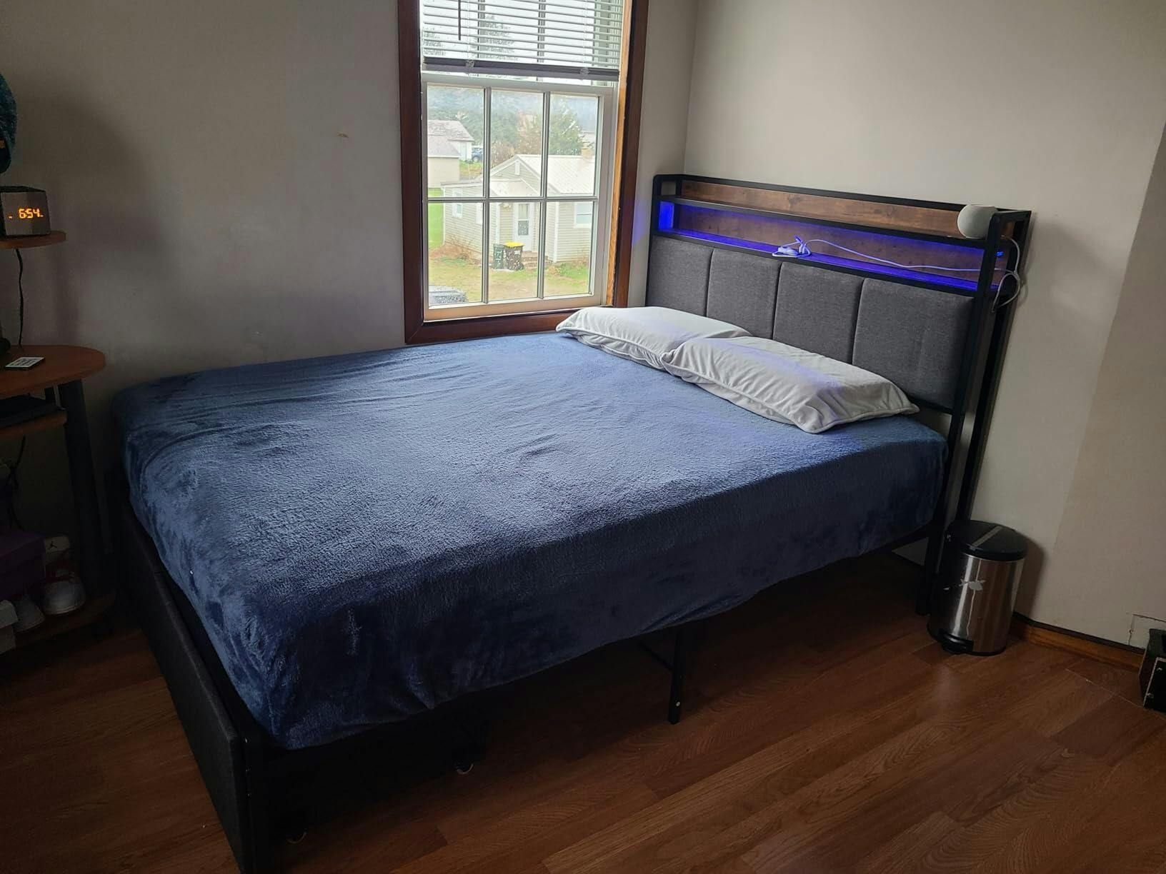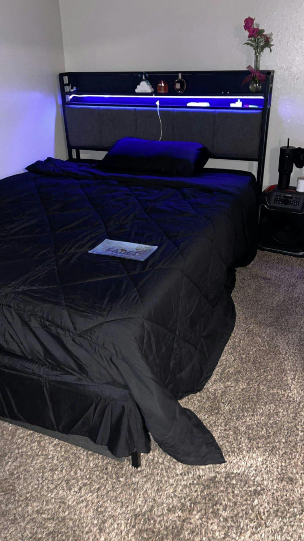 - 【Smart RGB LED Bed Frame】Controlled by remote control or app, this queen bed frame comes with beautiful multi-color RGB LED light strips (with over 60,000 color options). You can freely set the brightness, color, mode, and timing function, with flashing, gradient, different-speed jumps, and even music-synchronized light pulses, creating various atmospheres and designing your own light show.