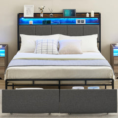 Garvee Queen Bed Frame with 2-Tier Storage Headboard, Upholstered Platform Bed Frame with 2 Storage Drawers, Built in Charging Station & LED, Noise-Free/Metal Support/No Box Spring Needed, Brown