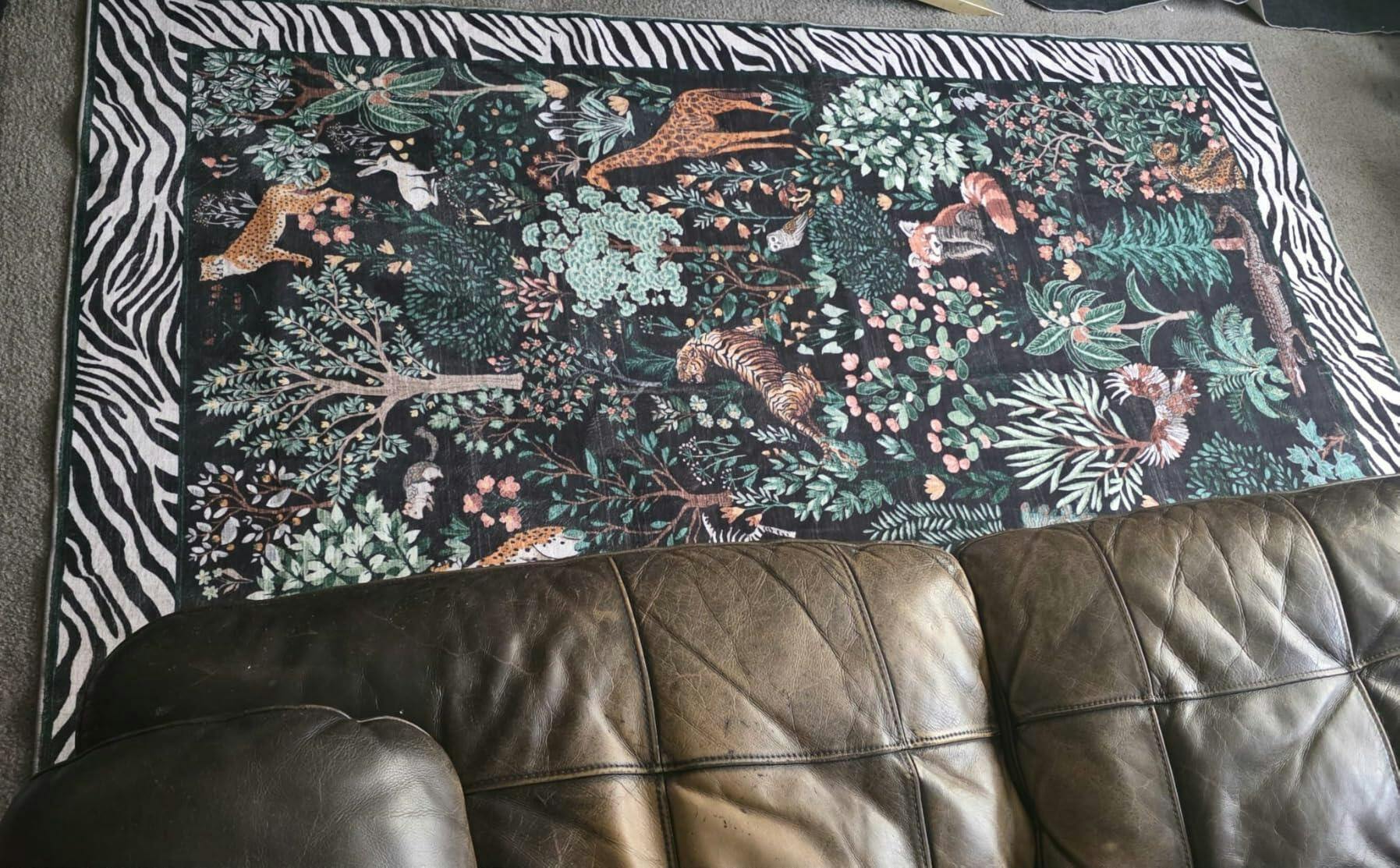I needed a change of scenery in my living room, so when I saw this jungle print area rug I had to try it!When my rug was delivered it was folded up. When I unfolded it, somehow there were no lasting creases or lines in the rug - which was nice. I mean, how do you iron a rug, right?! Thankfully I didn’t have to worry about that.It’s not very thick, but then area rugs are usually on the thinner side as they are usually more decoration than anything. It’s very soft - I just wanted to curl up and take a nap on it! The edges are sturdy and put together well - no weak spots or pulling apart that I could see.I’m going to have to invest in some animal print pillows now to go with the vivid, brightly-colored animal scenes. (I can’t say African Scenes because I noticed a Panda Bear in one corner…)I love this rug - it gives my living room a whole new energy!