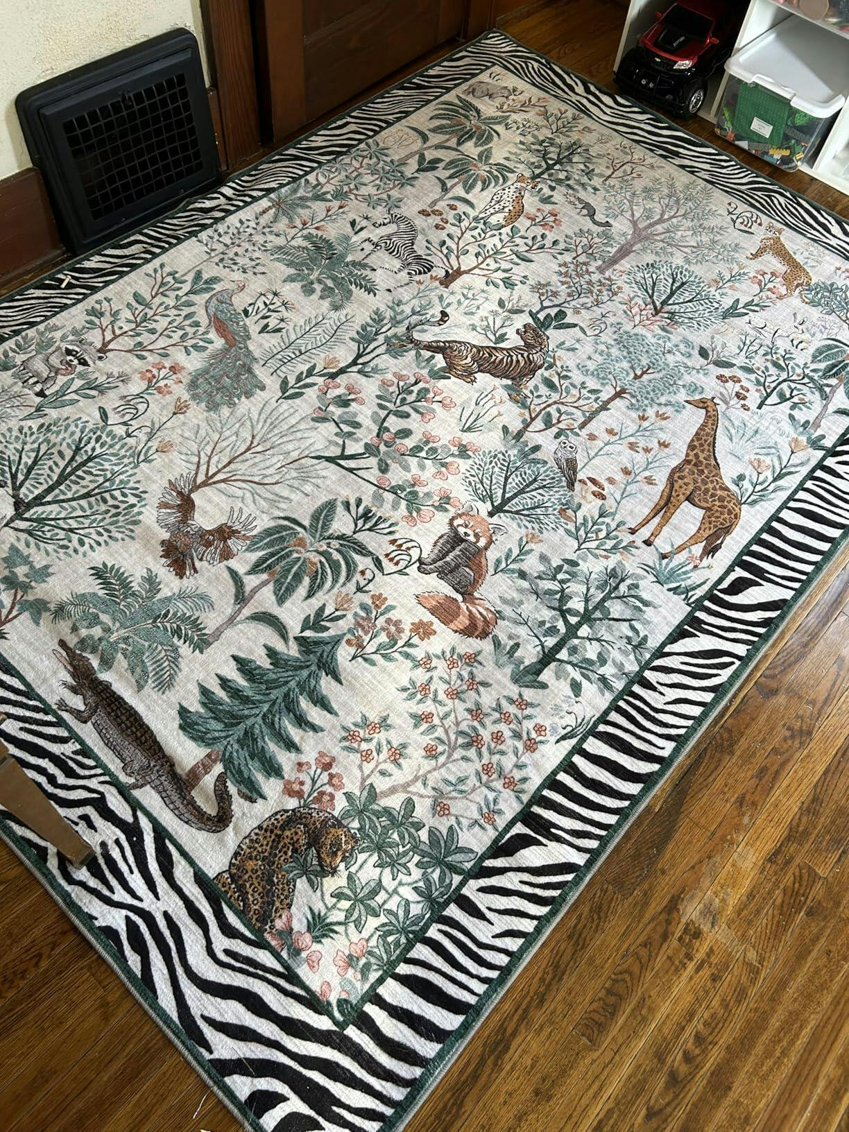 The GARVEE Jungle Rug is a fantastic find, especially for a playroom, nursery, or my case a home office that needs a fun, dynamic centerpiece. It delivers on style, comfort, and, most importantly for busy homes, extreme convenience.One of the surprises with this rug was the unboxing experience. The rug unpacks nicely without a lot of fold marks, which is a huge relief. It doesn't require days of waiting or heavy books to smooth it out; it lays flat pretty much right away, making installation quick and hassle-free.The material feels excellent underfoot. The low pile is crafted from a velvety soft material, and it is nice to touch with a good density and height. It offers a soft surface for play, crawling, fits under furniture or doors and my office chairs roll fine on it too.We chose the Tiger Camel pattern for the color, but the design is truly whimsical. The animals, rich colors, and botanical patterns create an immersive, vibrant visual experience. It instantly transforms a boring floor into an adventurous landscape, living up to its promise of being an aesthetic centerpiece.The entire rug is machine washable, which is a game-changer for spills and messes. It also has stain resistant finish and appears to be non-shedding fibers. While I was crawling around putting it under my desk, I didn’t get any fiber transfer onto my clothes. The non-slip backing is effective, keeping the rug securely in place on hardwood floors and preventing slips.Outstanding value for a rug that combines so much style with such easy maintenance.