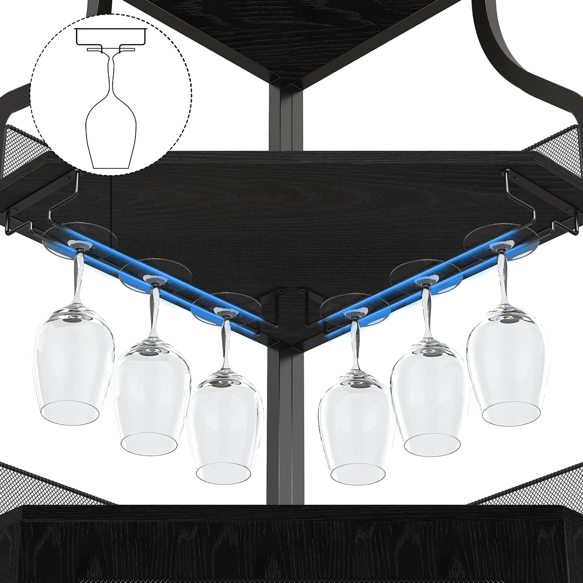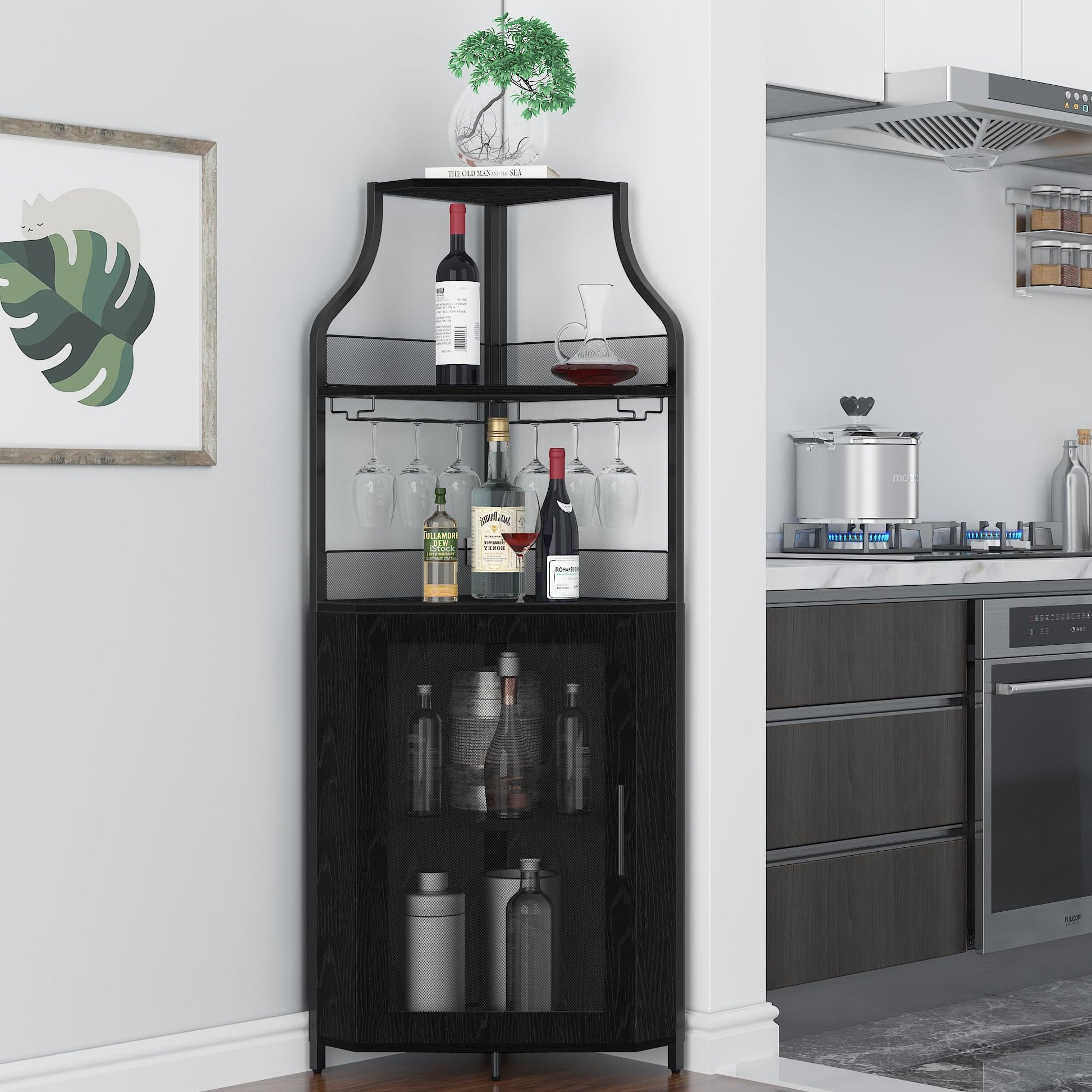 Garvee Corner Wine Bar Rack Cabinet with Detachable Wine Rack, Bar Cabinet with Glass Holder and Mesh Door, Liquor Coffe Bar Cabinet with Adjustable Shelves, Black