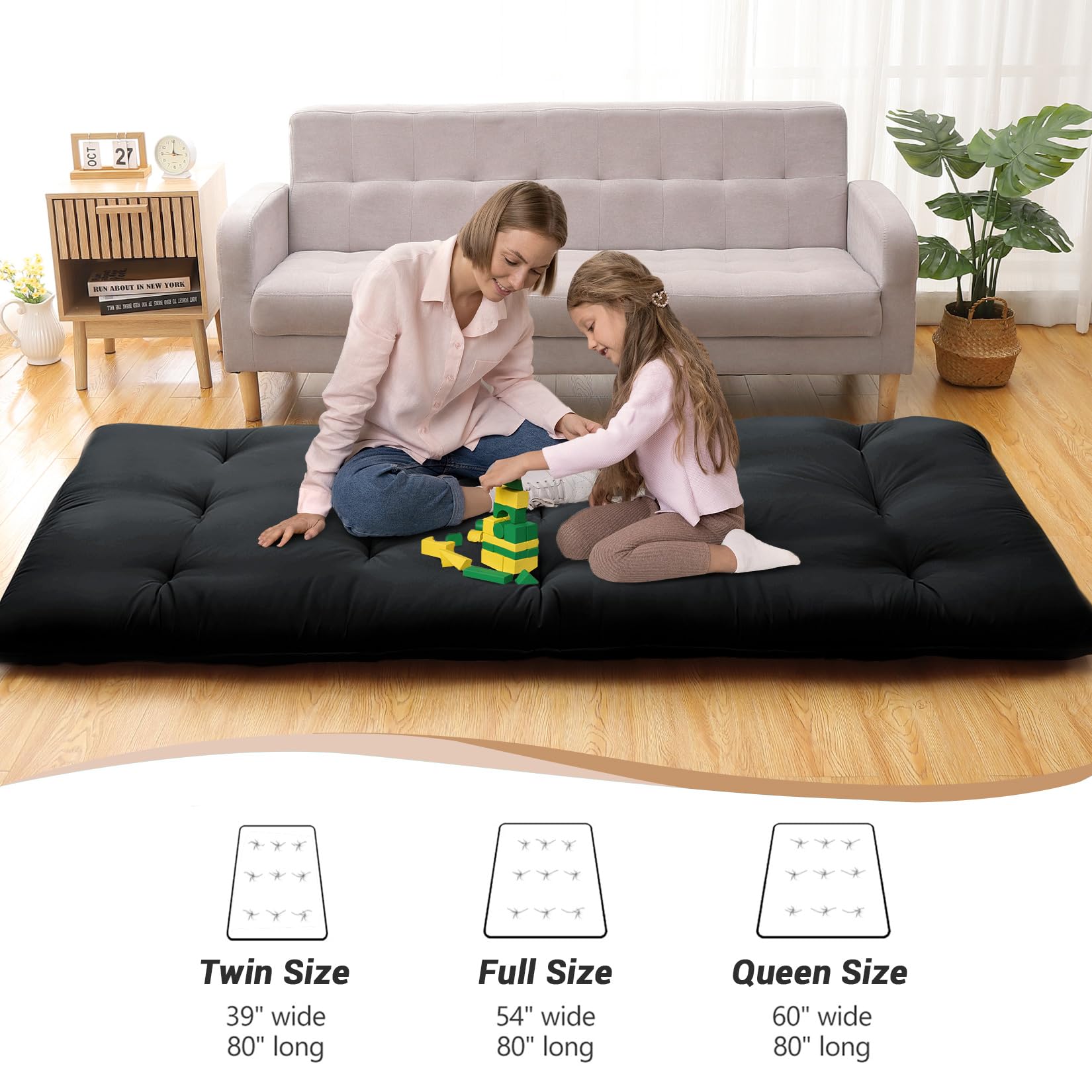 - Functional and Practical: This foam floor mattress can provide immediate comfort due to its flexibility. It is designed to be functional and practical, easily folding for storage or transport. You can use this floor mattress as a sleeping bed in your living room, bedroom, or guest room and as a kids floor play mat in play room, meanwhile, this futon mattress is also a camping mattress pad for RV travel and road trip.