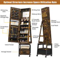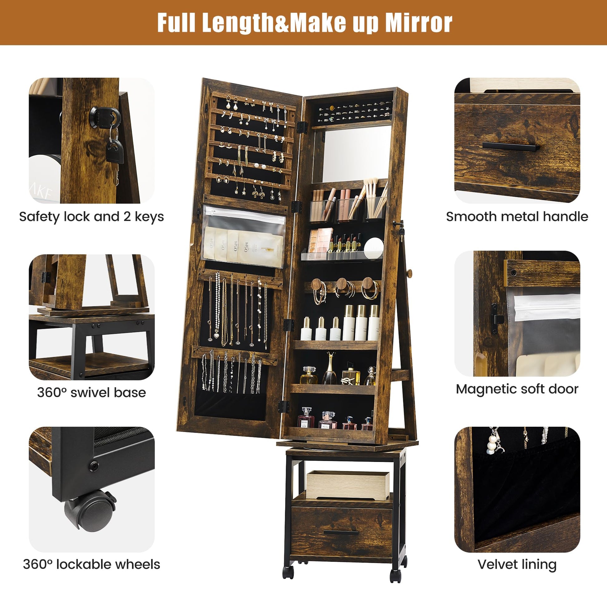 Garvee 360° Swivel Jewelry Armoire, 66" H Floor Standing Locking with Full Length Mirror, Inside Makeup Mirror, Bottom Drawer, Rear Storage Shelves, Wheels, Brown Cabinet with Large Storage Capacity
