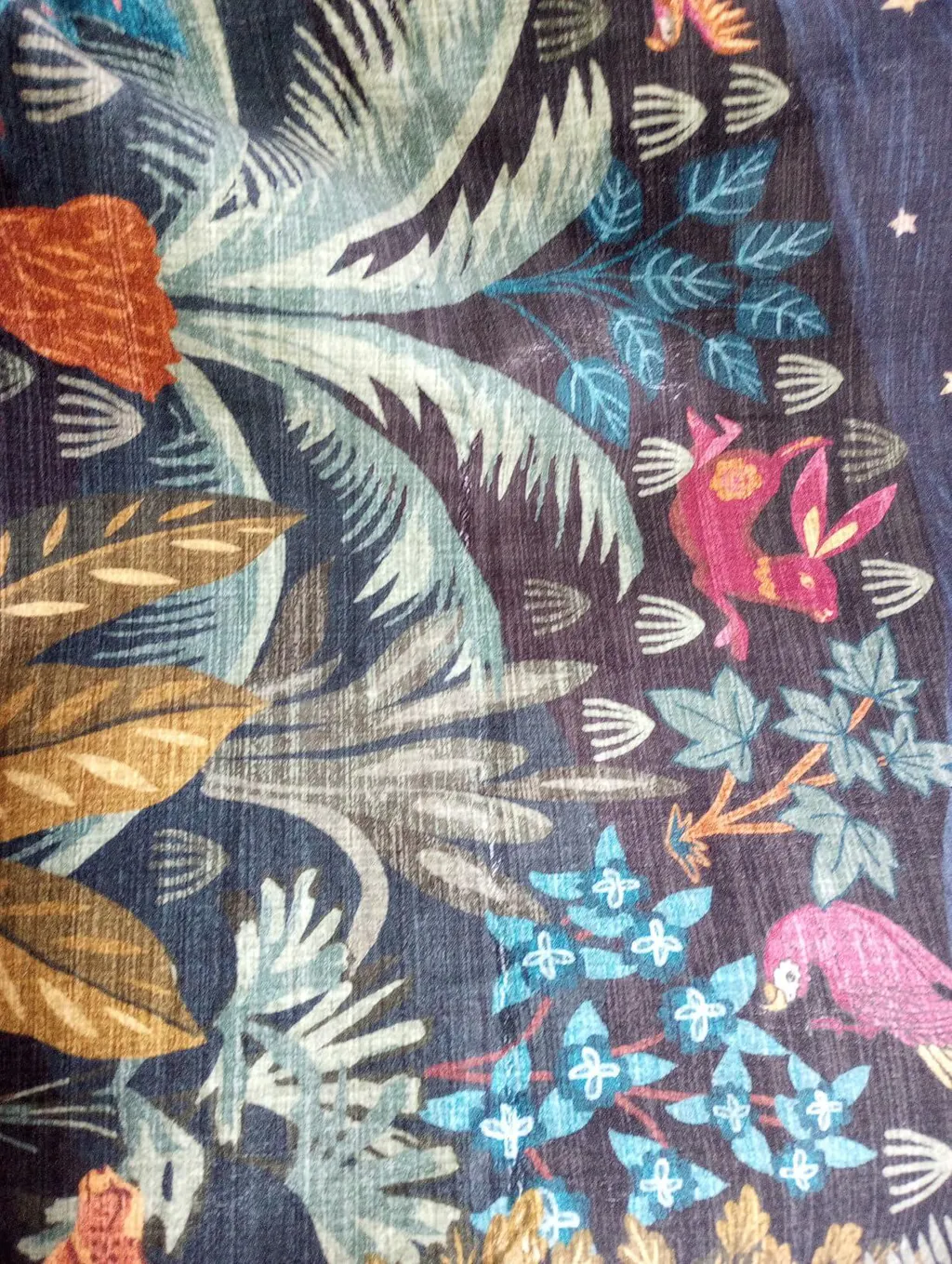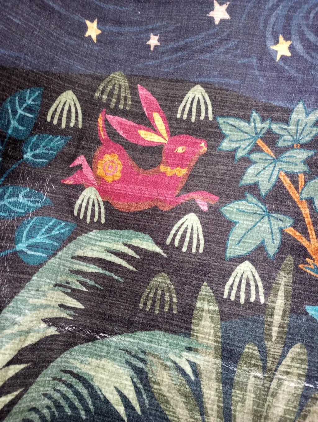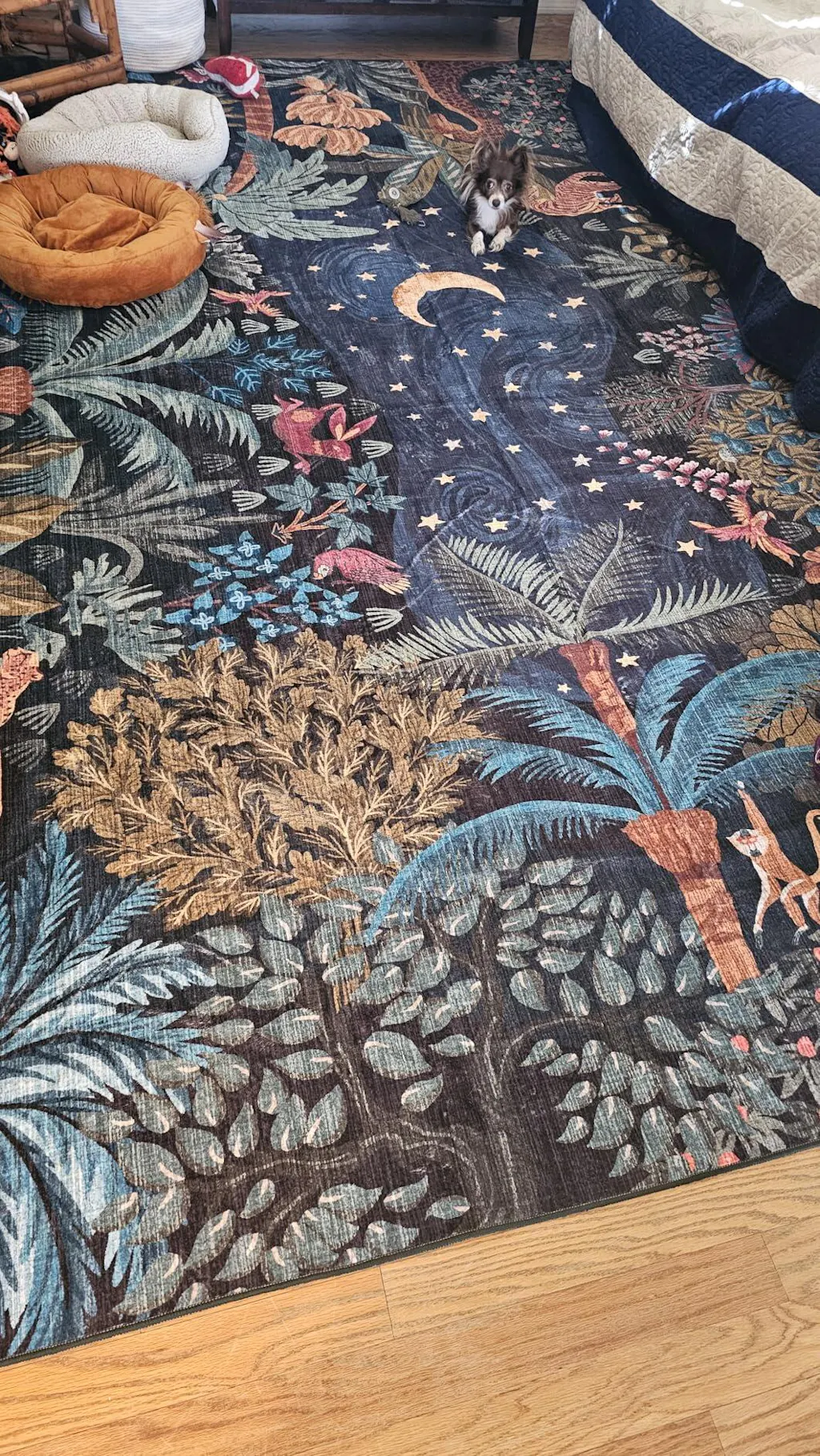This rug gets a big wow from me! The colors are beautiful and all the animals and plants on this rug really make the room exactly what I was looking for. The rug is made well and it’s nice and soft, even though the pile is very low. All the colors are very saturated so this rug is very bright and has lots of movement in it. The edges were stitched tightly in the non-skid backing works very well and keeps the rug in place. There was no shedding and there was no smell. This rug was ready to go and I’m very excited. It’s so different than anything you could find at the store! Very happy.