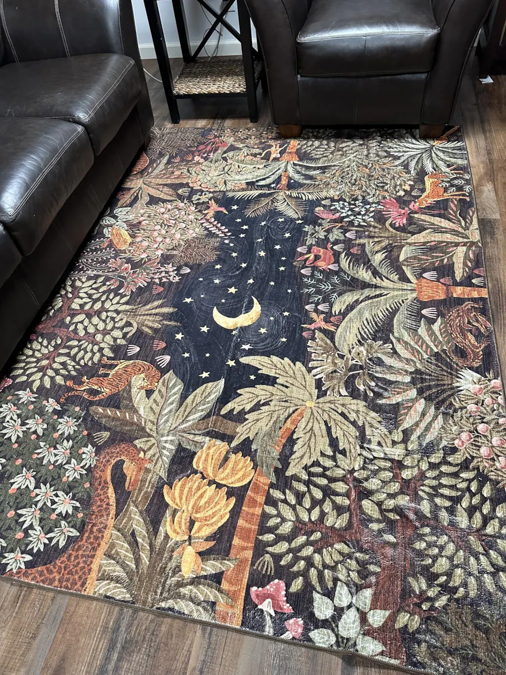 This is such a fun addition to the TV roonm/man cave... just in time for the big game(s). I love the jungle pattern for kids and for the manly men who cheer for their favorite teams (and yell at the TV). The rug is soft and plush with a non-skid backing - so you don't slip as you get up to cheer!I just put it down today and love how the 5 X 7 rug fits in front of the couch and chair. (I put the coffee table/ottoman back after I took the picture.) The jungle pattern is nicely done and kids will love picking out their favorite animals. It is dark enough it won't show dirt and low enough that the robot vacuum can navigate it with ease. It's also machine washable -- probably best to use a commercial machine when the time comes.I'm so happy! This is just what the TV room needed.