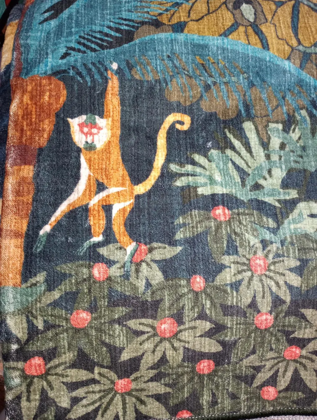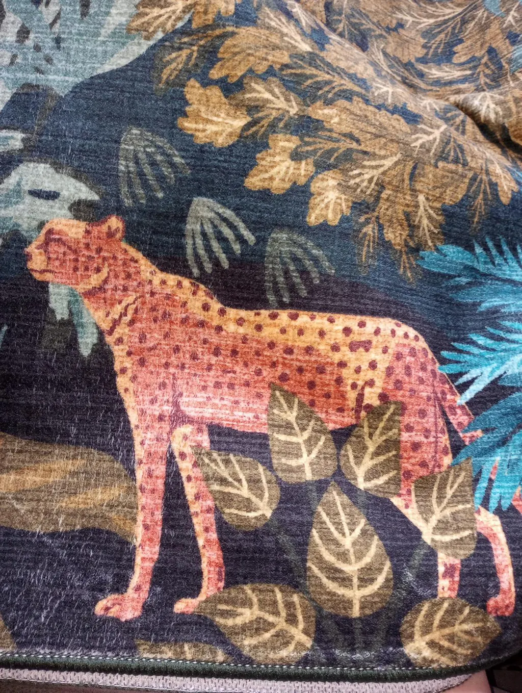 This is a luxurious 5 foot by 7 foot area rug with a really interesting jungle print design.This is set in a luscious green jungle.This rug has a non-slip rubberized backing with a low pile height. The material is stain resistant and machine washable.This is a really fun print rug that would look good in any room you choose to put it in. It would also be perfect in a childs playroom or a child's bedroom.This rug has fine quality stitching along the edges. This rug is made in China.