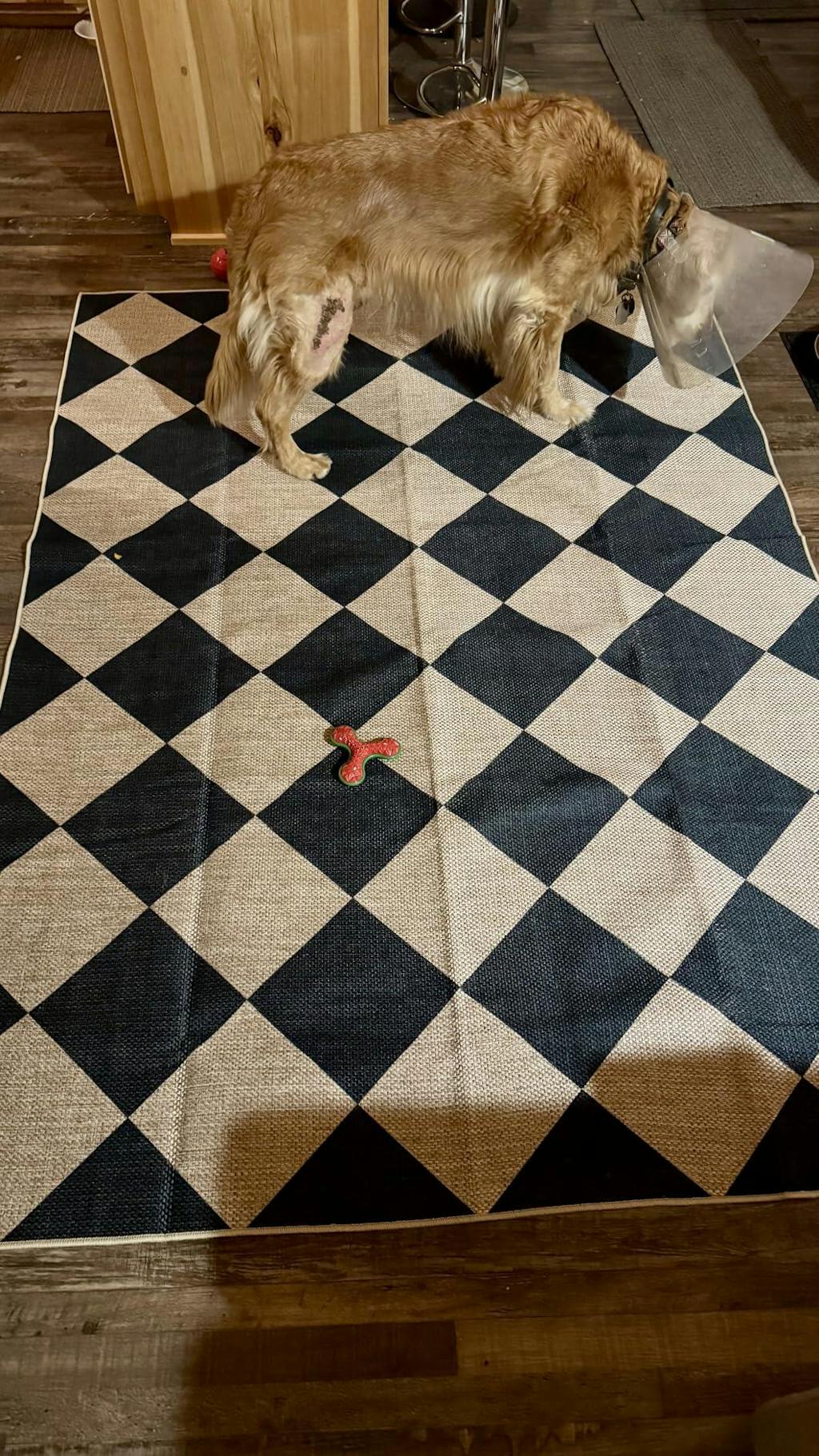My golden has issues with slipping on the floor. Rugs that have grip help him. This rug is good for that. It sticks really well to the floor and dues not move around. It’s soft. It’s not very thick. The color on the package says black and white. It’s not white at all. Easy to vacuum and wash. Good value.