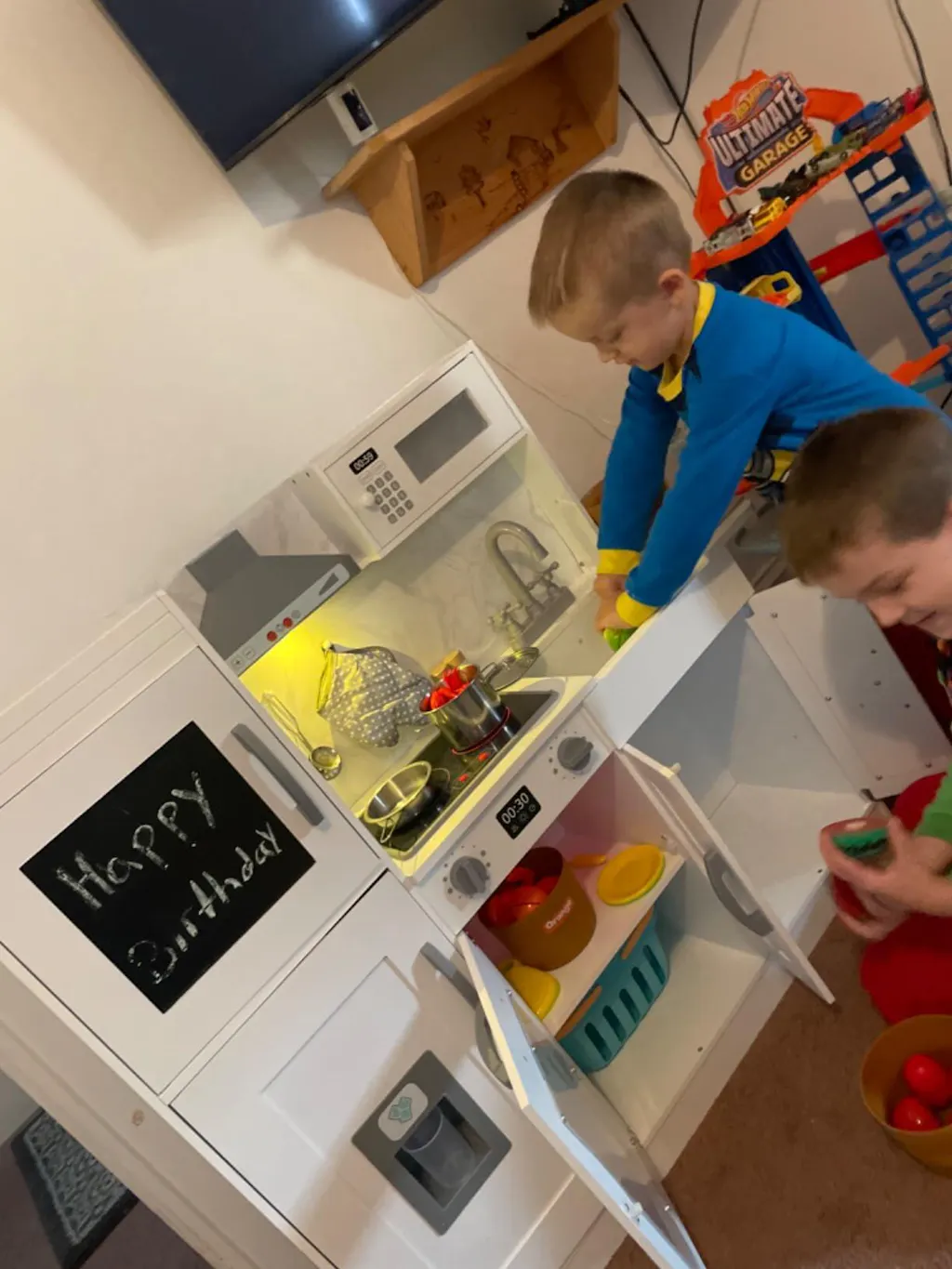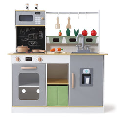 - FUNCTIONS: Turn on the button of stove and range hood, it will light and make sound like real cooking. Ice cubes drop down when button of ice maker is pressed. Chalkboard will help recor & show recipe. And also the little chef would get endless fun with this oven, microwave, faucet, and sink.