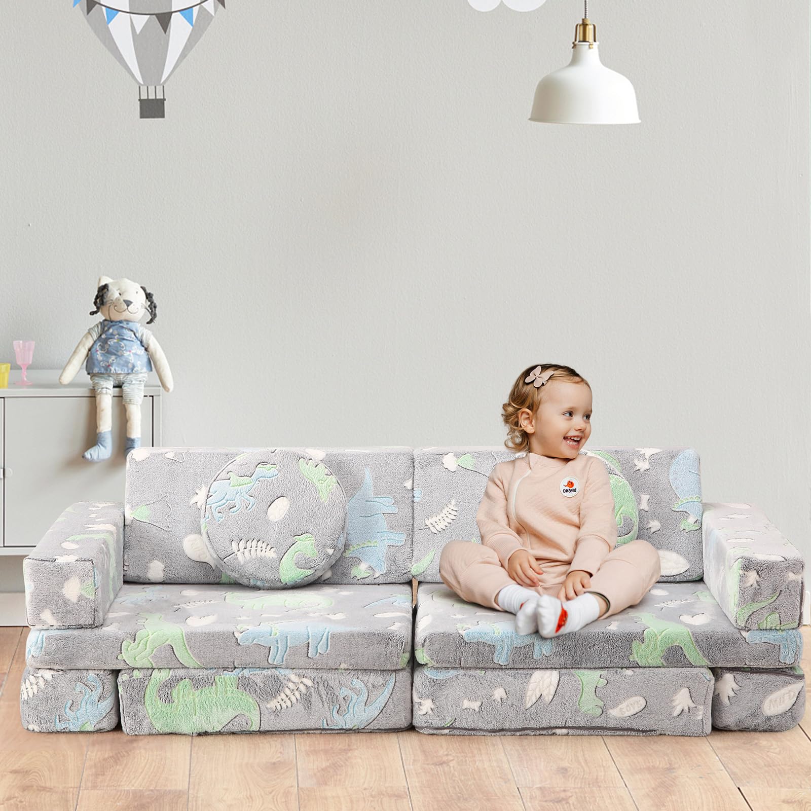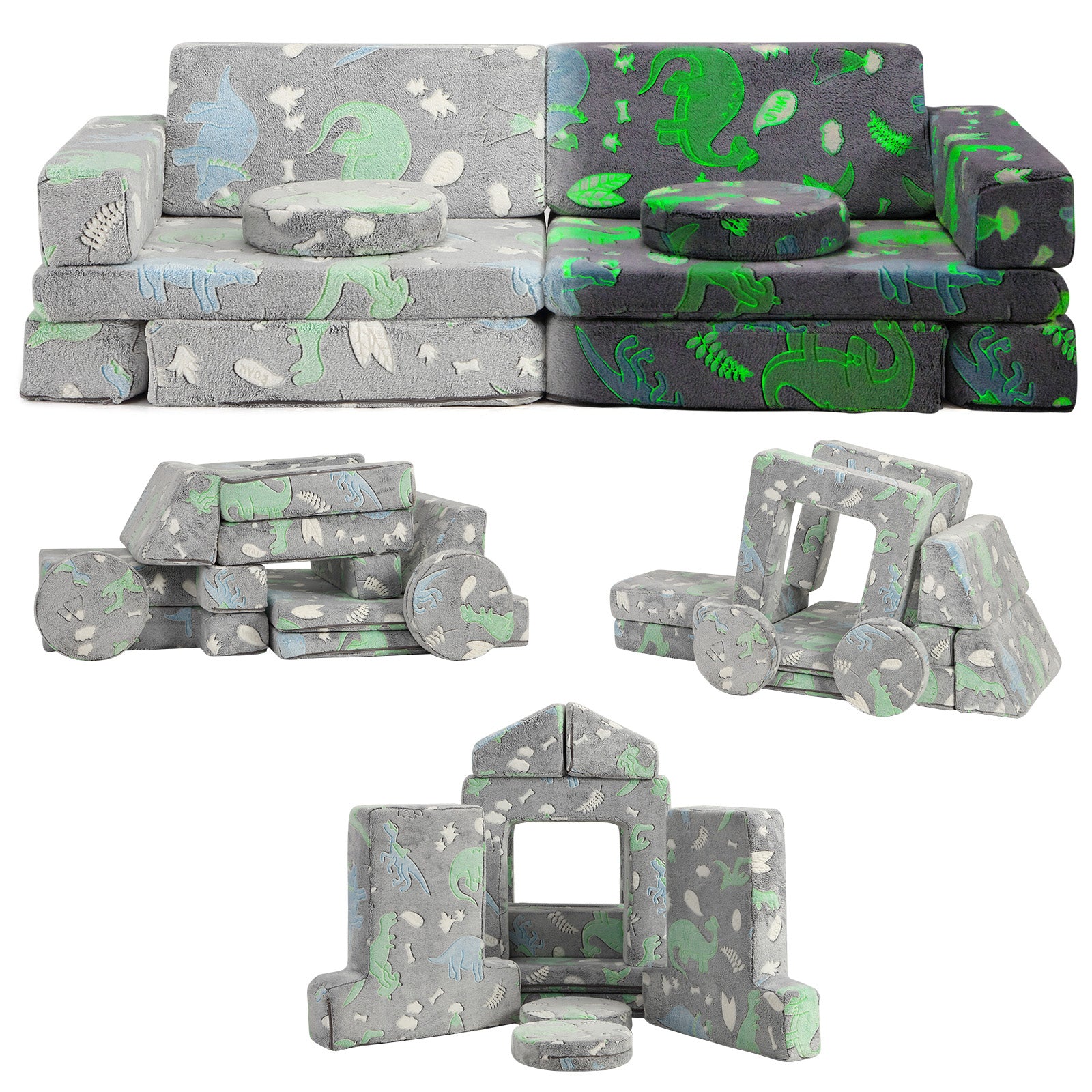Garvee 12 Piece Modular Kids Couch, Convertible Dinosaur Glow in The Dark Sofa for Play, Sleep, and Imagination in Bedroom or Playroom for Boys and Girls