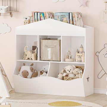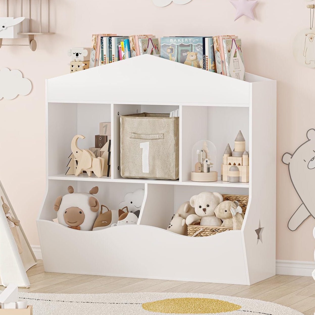 Versatile design combines bookshelf and toy cabinet, providing ample space for organizing various items in one compact unit.