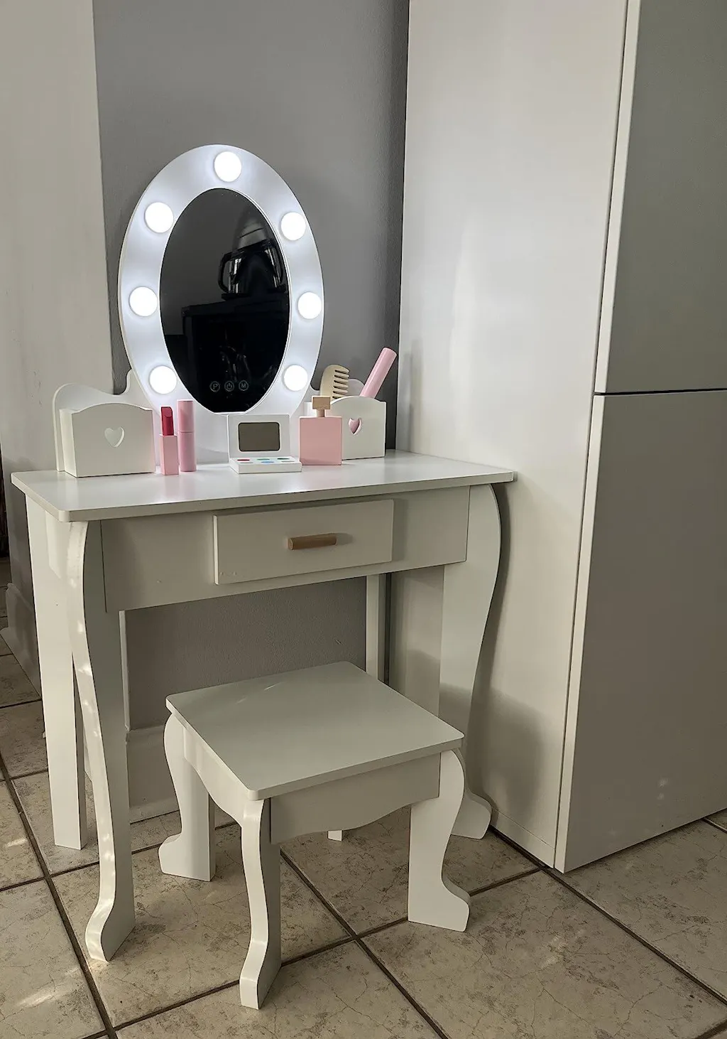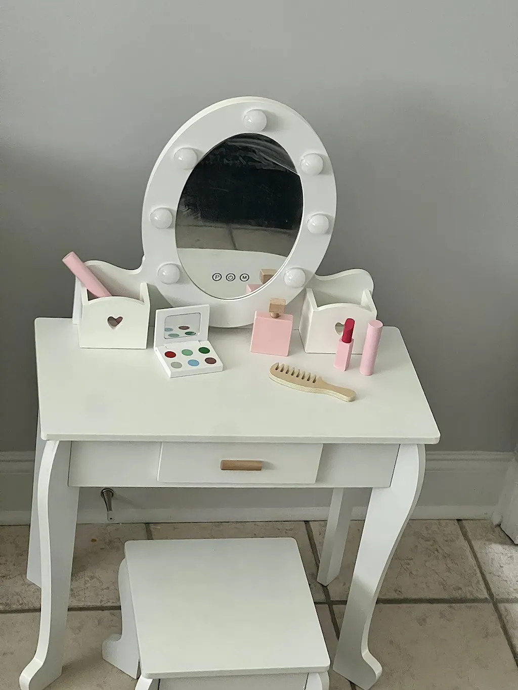 With its elegant white finish, touch-activated lights, and realistic mirror, this set combines beauty with functionality. The sturdy construction ensures stability, making it safe for children and built to last.