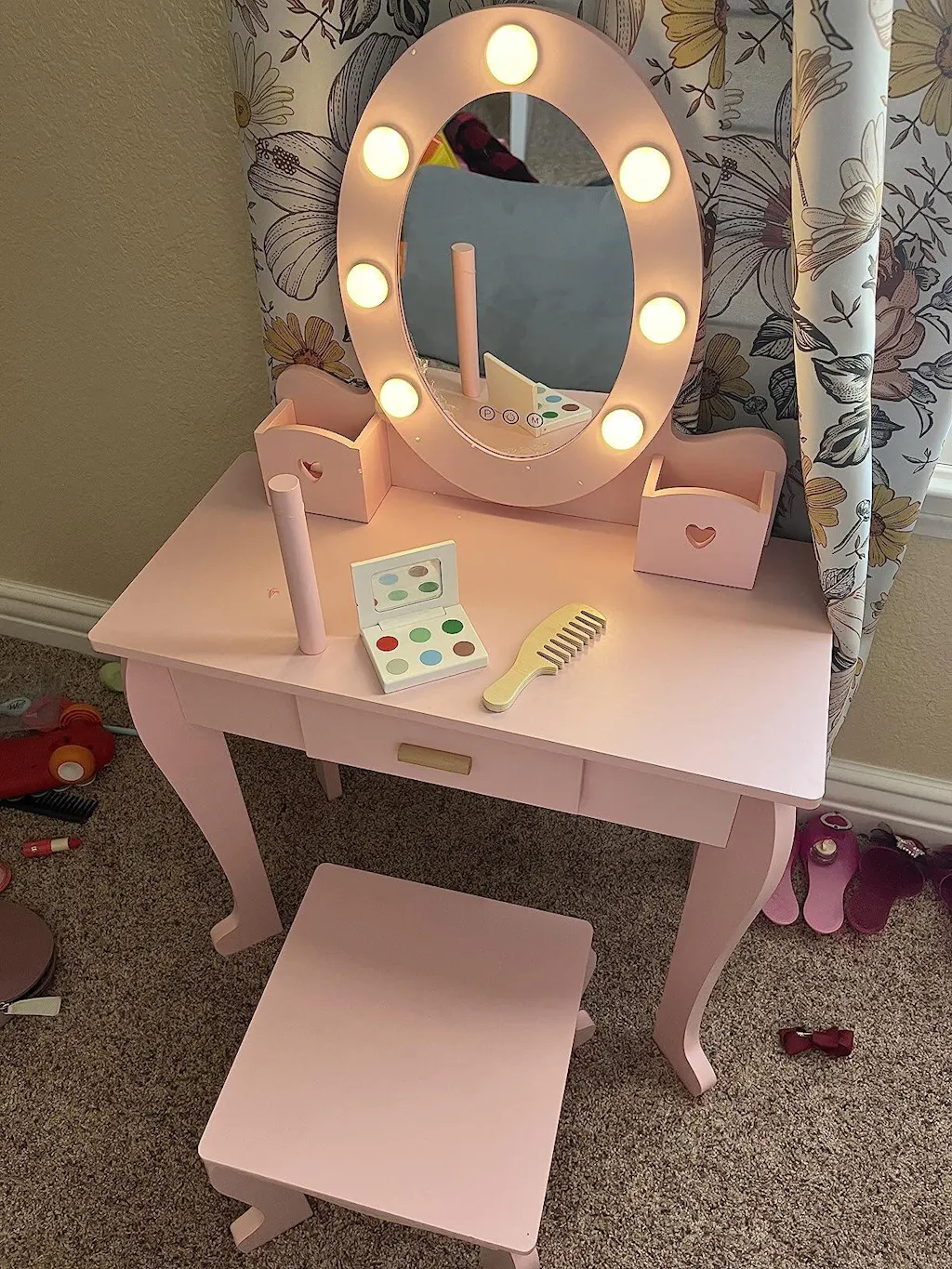 Includes a beautifully crafted desk, comfortable stool, and a realistic makeup playset for endless hours of pretend play.
