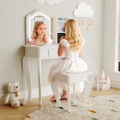 - Enchanting Pretend Play Hub: Wooden kids vanity with desk, stool, real mirror, and storage inspires creative role-play and tidy habits.