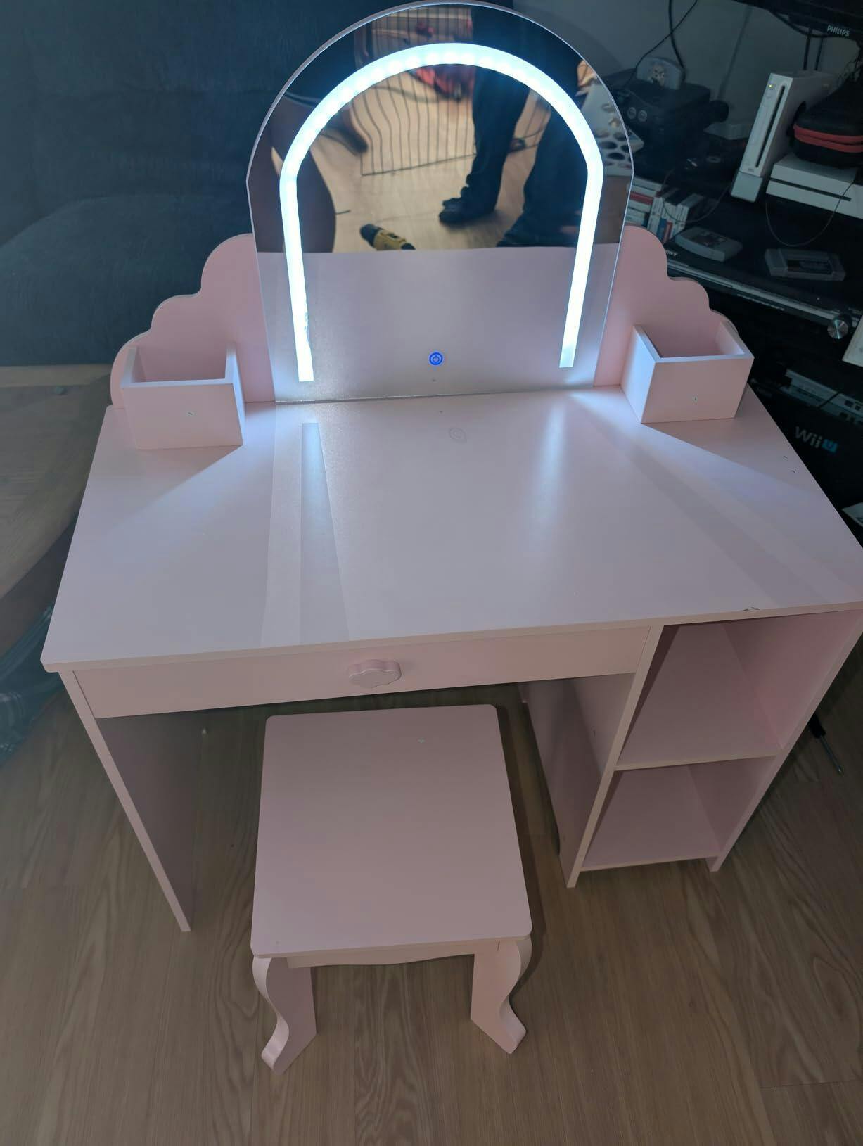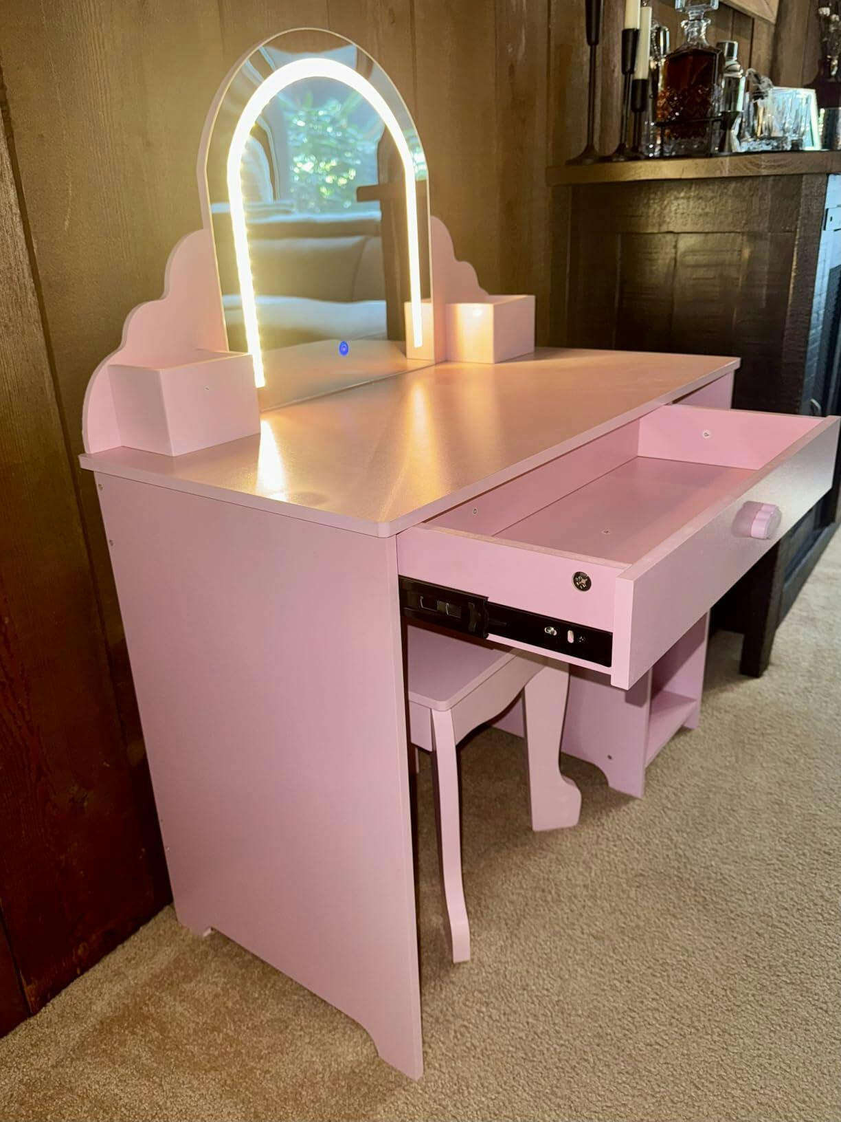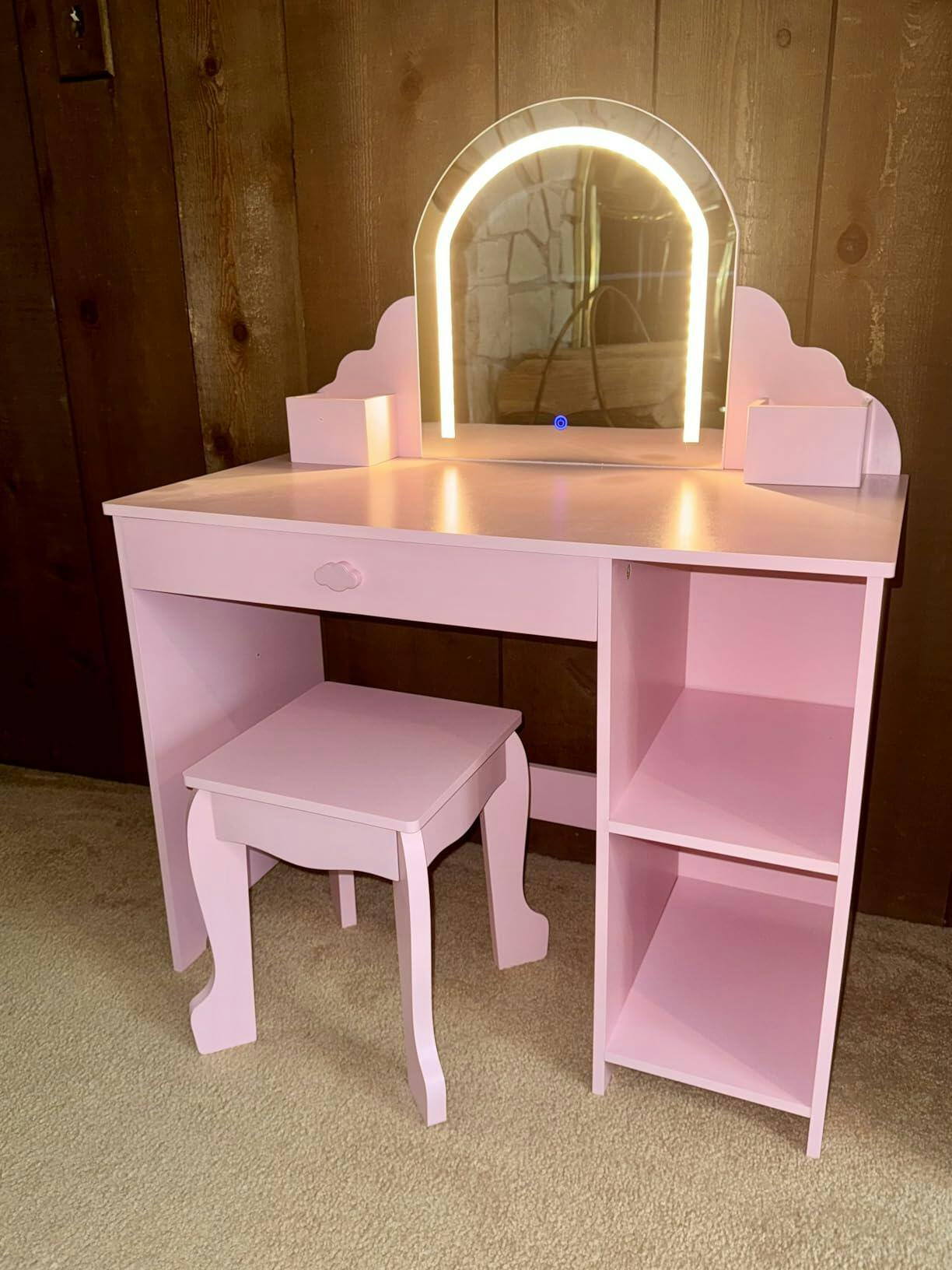 This vanity set is such a sweet and practical piece for kids. The lighted mirror is the standout feature, the adjustable LED lights make it feel like a “real” vanity, which adds to the excitement and fun for little girls. It’s bright enough to be functional but not harsh, so it’s safe for everyday play.The design is thoughtful and well-made, with a roomy storage drawer and side shelves that are perfect for organizing play makeup, hair accessories, or small toys. The included stool is sturdy and sized just right for children, and the overall vanity feels stable and safe once assembled.The pink finish is cheerful and pretty, making it a perfect fit for a little girl’s bedroom or playroom. Assembly was straightforward, with clear instructions, and the materials feel durable enough to withstand daily use.What I really appreciate is that this vanity encourages imaginative play while also teaching organization, kids love having their own special space to get ready and keep their things neat. It’s a great gift idea for birthdays, holidays, or as a special surprise.Fit note: Best suited for ages 3–9, and the stool is strong enough for kids to sit comfortably without wobbling.