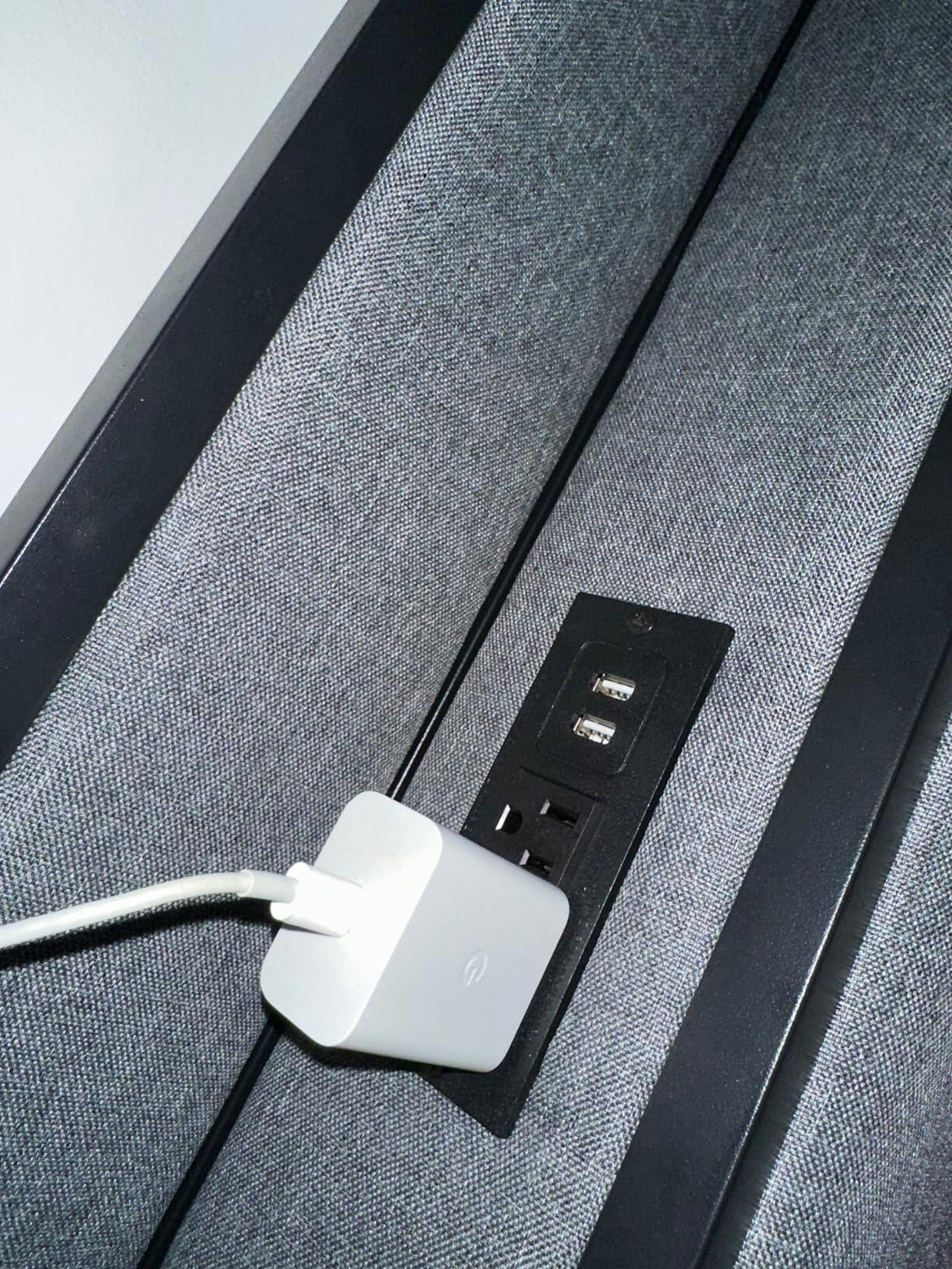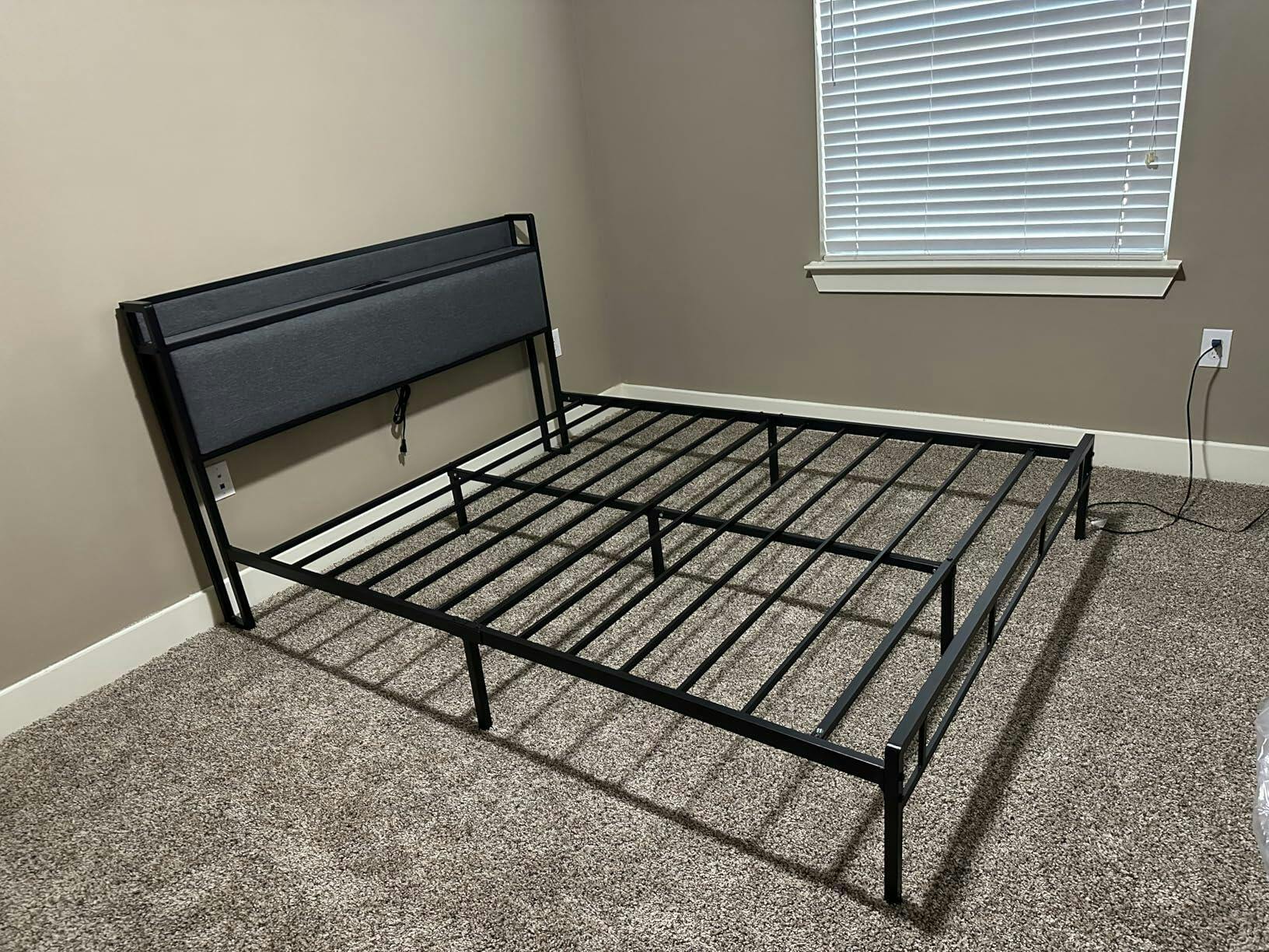- King Bed Frame with Charging Station - connected effortlessly! Enhance your bedroom experience with our king upholstered low-profile storage bed frame with a headboard featuring 2 outlets, USB ports, and a Type-C charging port. Now, you can conveniently charge your phone and tablet while relaxing in bed.
