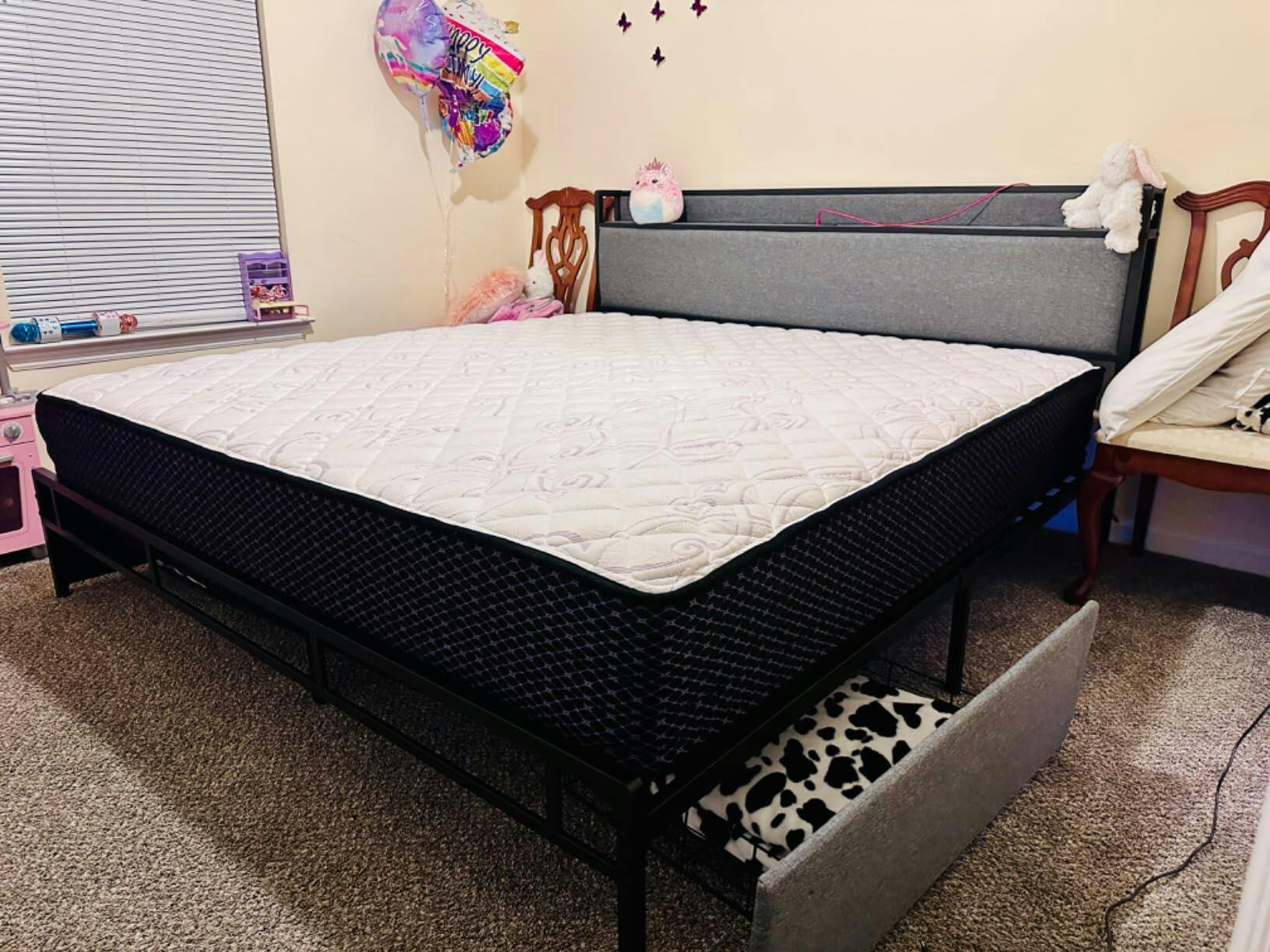 - No Box Spring Needed - Elevate your sleeping experience with our meticulously designed king headboard with storage. Equipped with 12 sturdy steel slats and central support, the bed frame king size bed frames with headboard and drawers that securely holds your mattress, preventing sagging. Supporting up to 1000 lbs, it guarantees durability and stability without the hassle of springs. Compatible with 8-14 inch mattresses, it ensures a comfortable and restful night's sleep.