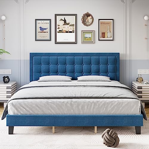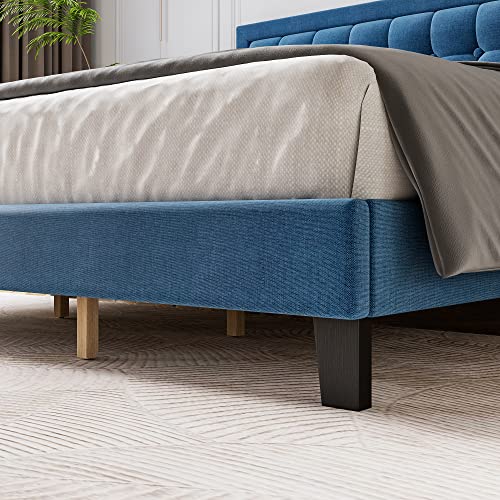 Garvee King Size Platform Bed Frame + Upholstered Button Tufted Headboard + Metal Foundation + Wood Slats Support + Adjustable Headboard + Noise-Free Design + No Box Spring Needed + Easy Assembly for Bedroom in Blue