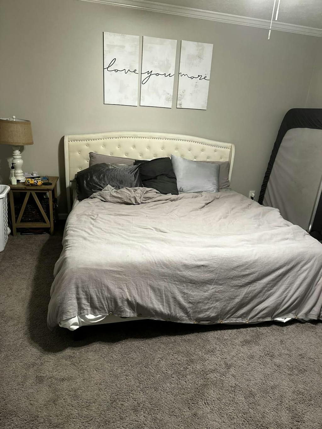 - Button-tufted headboard for added sophistication