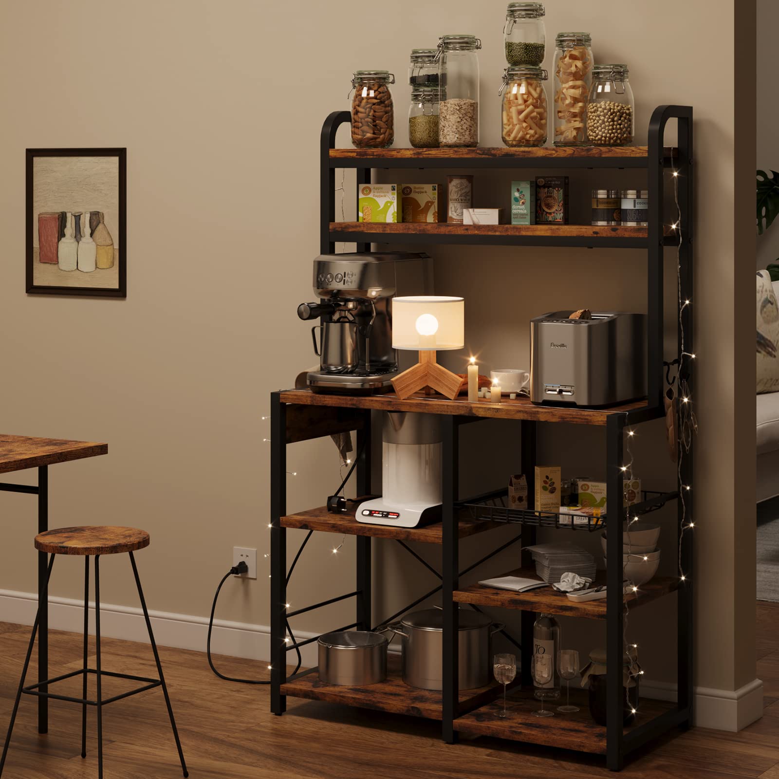 Garvee Bakers Rack with Power Outlet, Coffee Bar with Wire Drawer, Microwave Stand, Kitchen Buffet Table with Large Storage, 6-Tier Kitchen Storage Rack with Hutch for Dining, Living Room, Brown