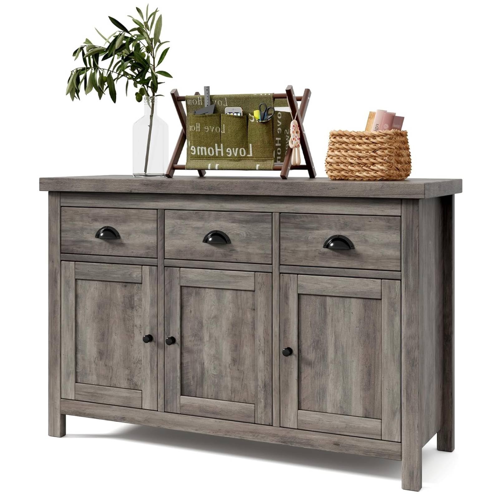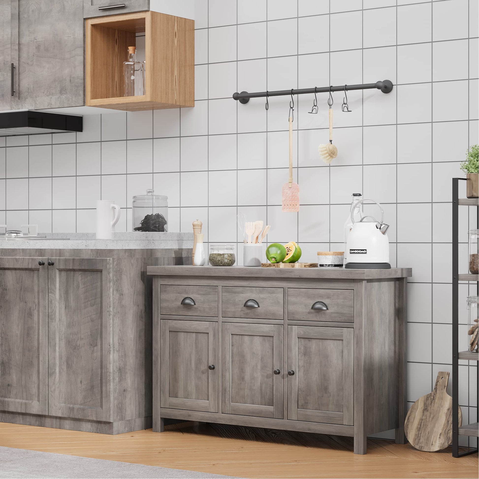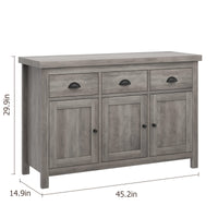 Garvee Kitchen Cabinet Sideboard with Storage, 3 Drawers, 3 Doors, Farmhouse Design, Retro Handle, Adjustable Shelves, Grey Wash