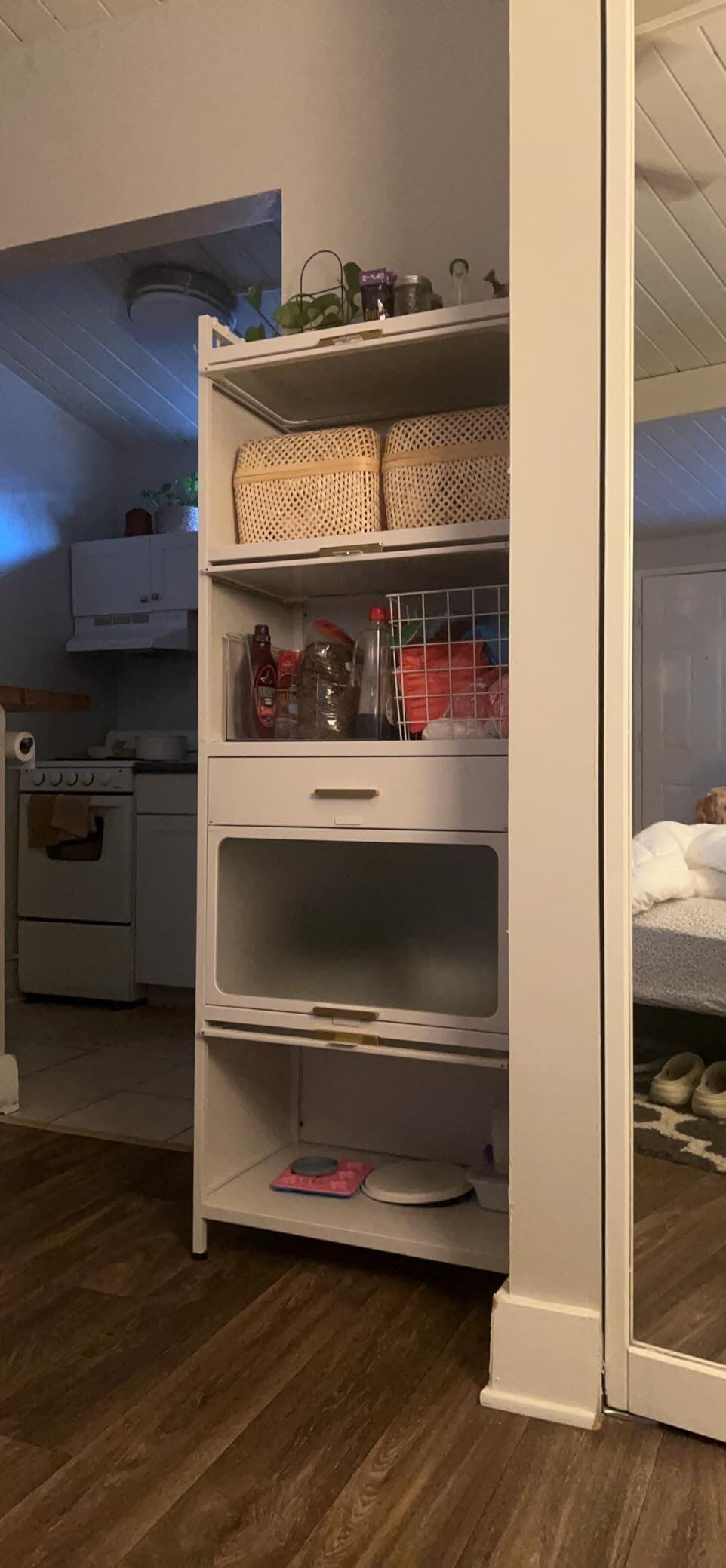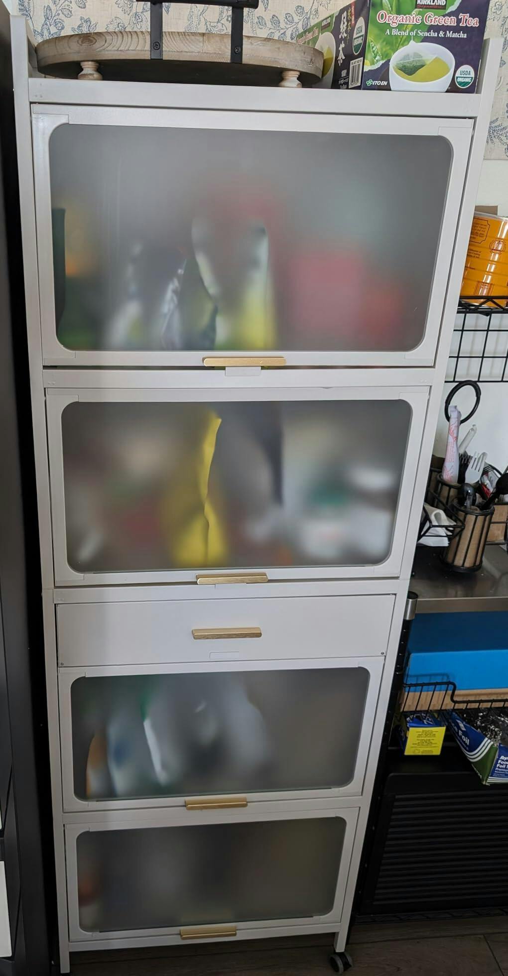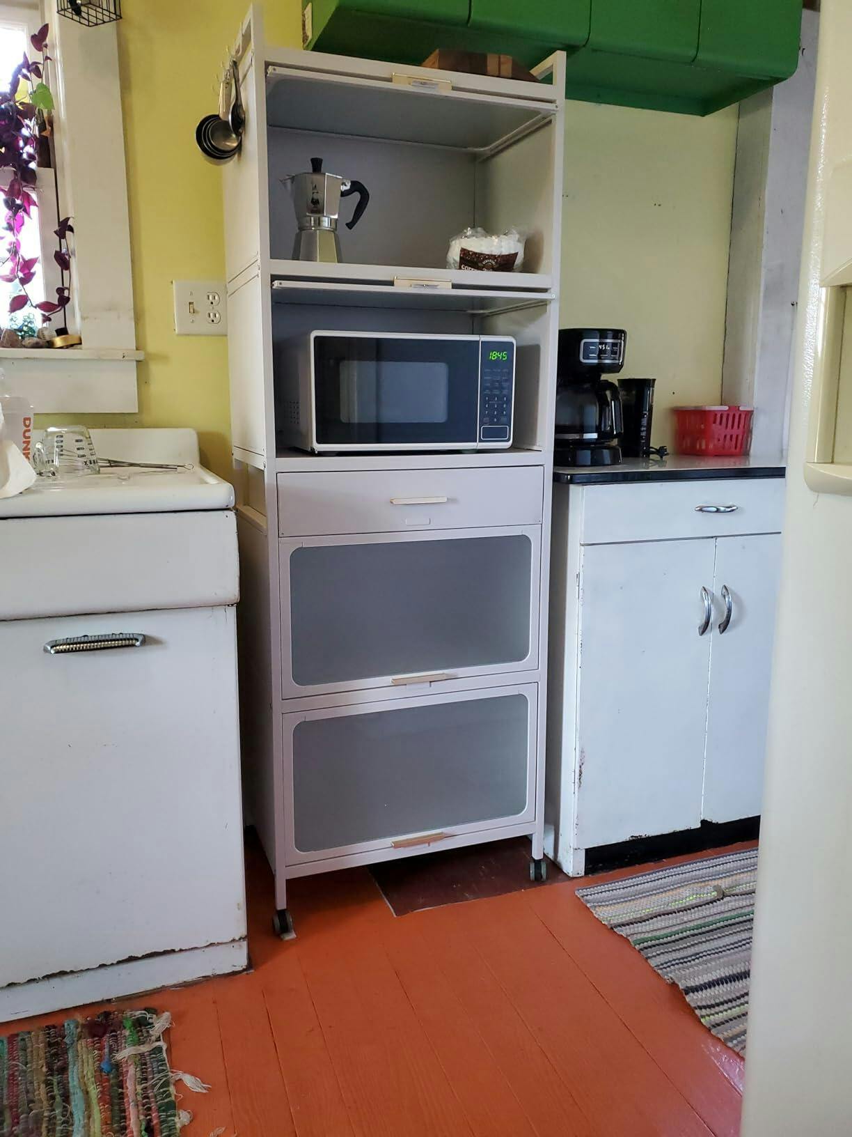 - [Versatile Storage Space]: The rolling microwave stand features 5-tier storage space with semi-translucent doors to help keep kitchen appliances, tableware, snacks, pots, and pans organized and dust-free.