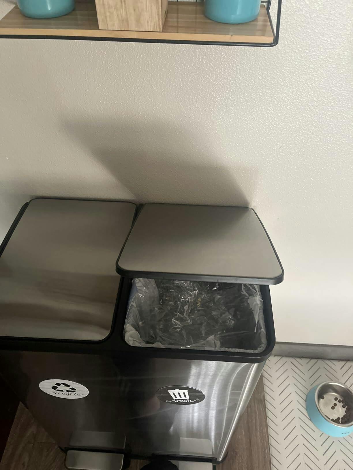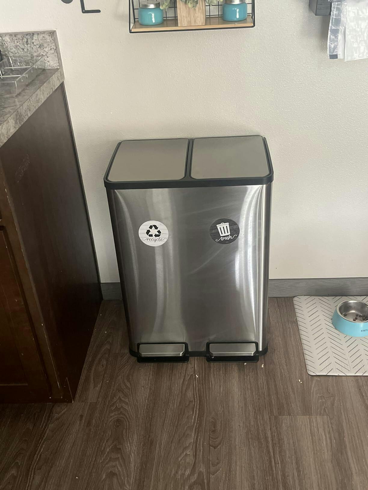 - 3 Compartments Trash Can - Featured with 3 separate compartments, this trash can will keep daily trash and recyclables or other materials sorted, making your space looking neat and tidy. Made of stainless steel, simple silhouette with silver and black colors, this garbage can will be an eye-catcher in your kitchen.