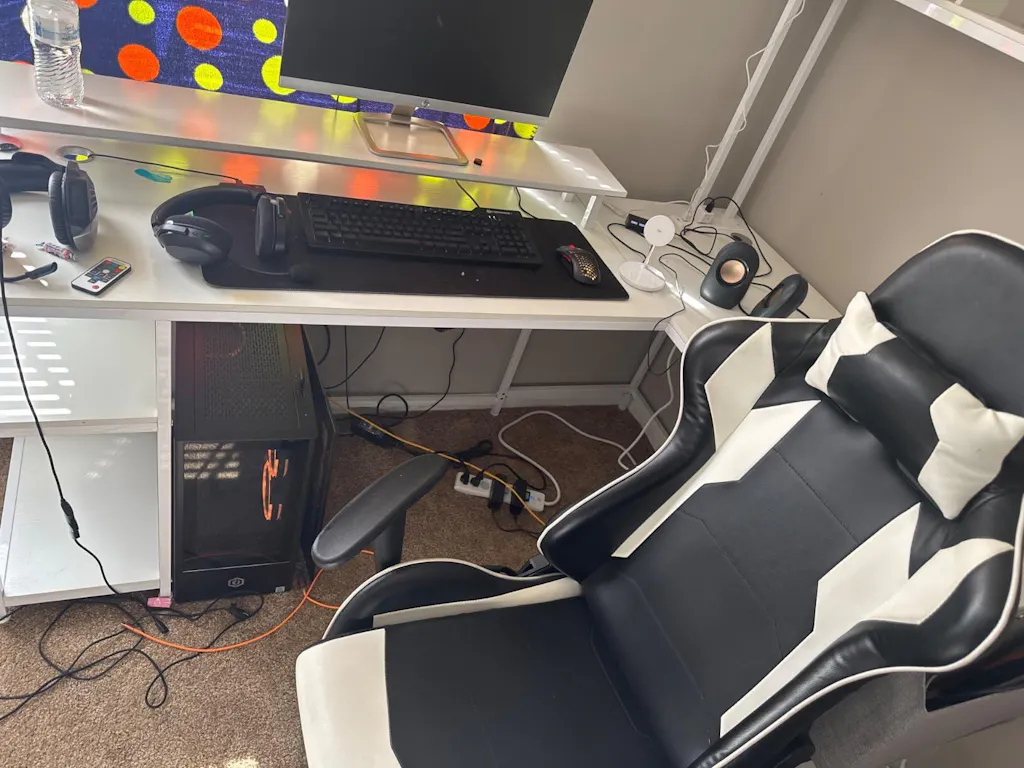 With its spacious design, built-in monitor stand, and ample storage shelves, this desk combines functionality with style. The ergonomic layout ensures comfort during long gaming sessions.