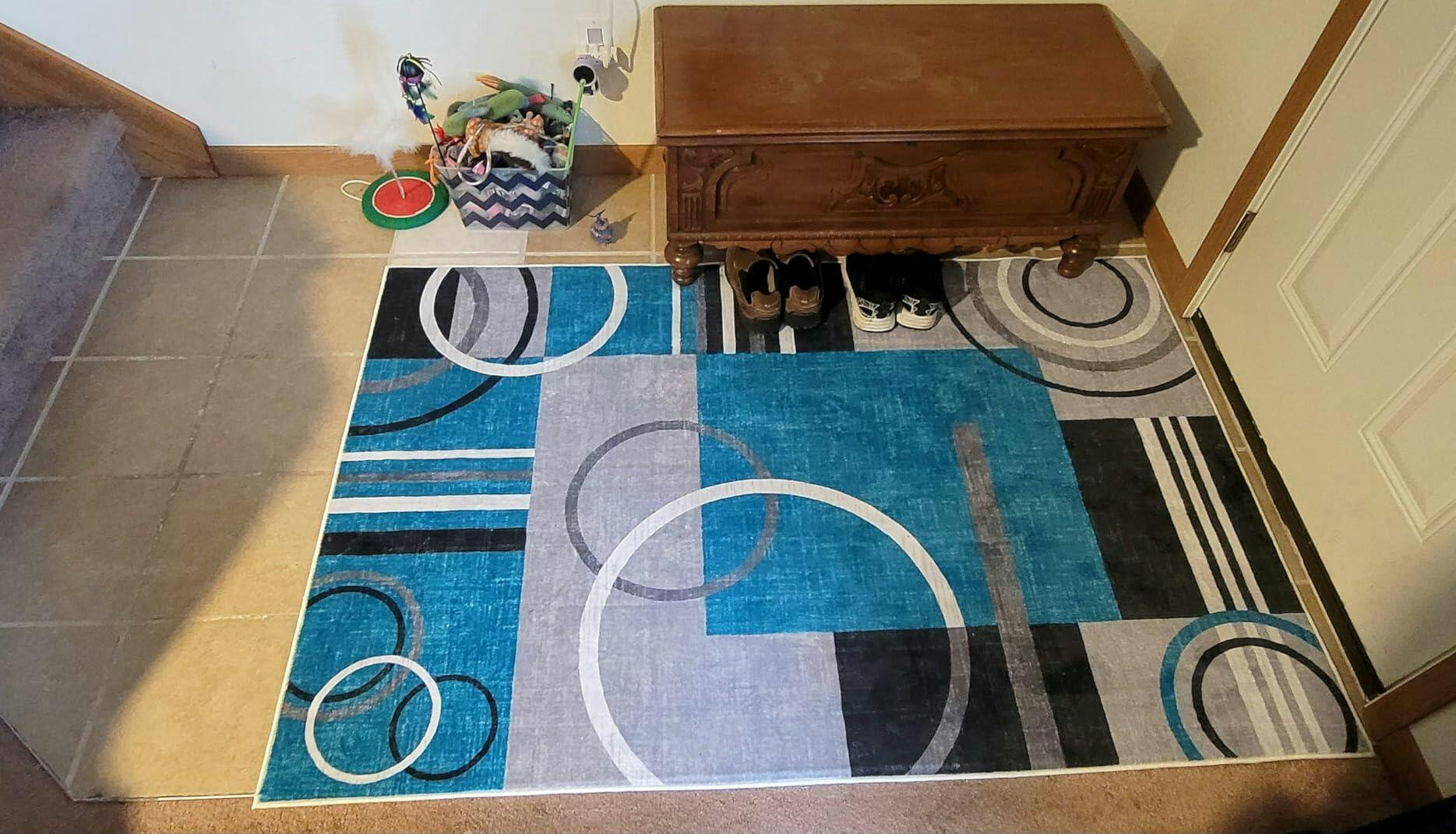 This 4x6 rug fits perfectly into the entryway of our home. The colors nicely complement our silver/grey and teal drapes.This rug is thin and durable making it perfect for anywhere a door is involved. It is also silky soft and slip resistant. The rug arrived folded up but it was easy to unfold and the creases were gone in a matter of days.Overall this rug is a very good value!