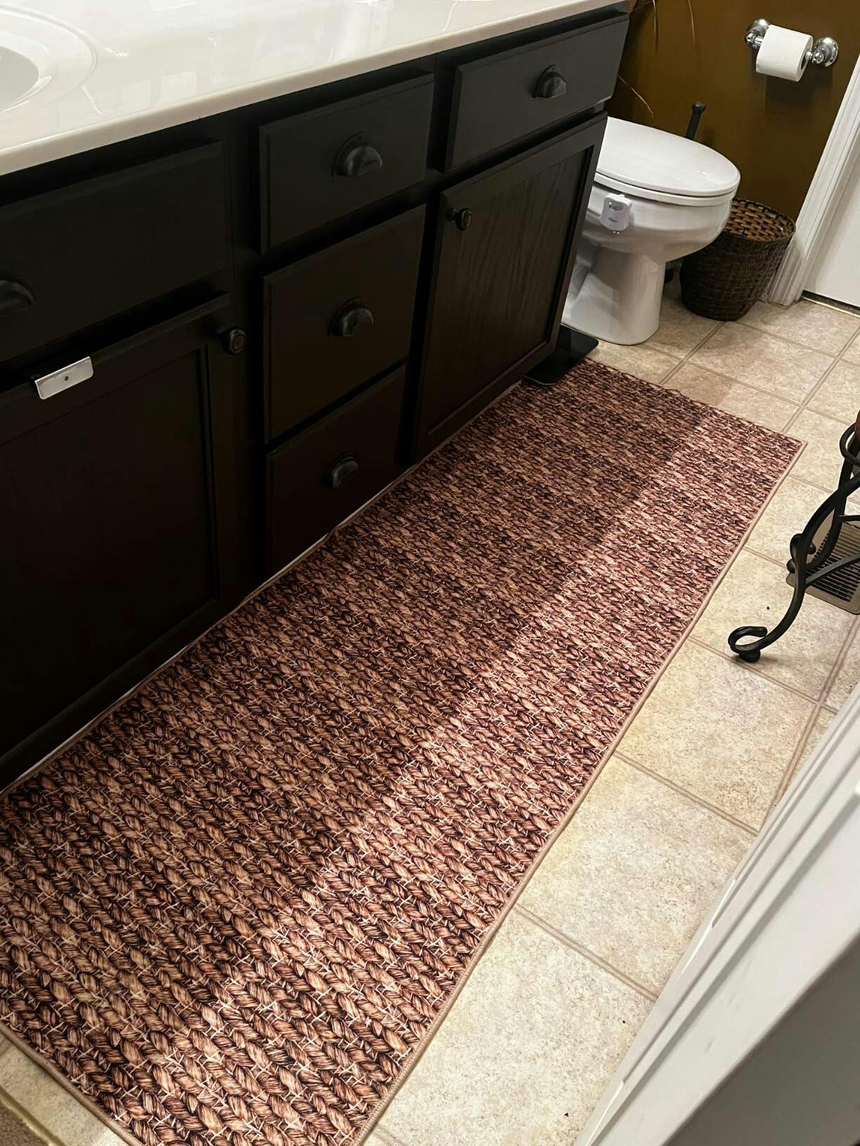 I have a jute rug in my bathroom that I really like. When I came across this one I decided to order it for replacement because of the colors in it. I recently painted my cabinets a dark brown and this rug had those same dark hues in it that matched really well. Because I like the jute material of my other rug I figured this would be a great replacement.When the package arrived I was quite surprised of the size as I didn’t think jute would fold that small. Well, I quickly took it out the package and to my utter disappointment I realized that it was not a jute rug! It was like a painted jute look. Aaaargggh!Once I completely took it out the package and laid it out on the floor, my feelings started to change. I actually liked the look. I quickly ran upstairs to put it in my bathroom to see how it would look. It looked fantastic (see pic).I was concerned with the length being too long but I think it looks fine. It really brings my bathroom together. It’s a perfect addition.There was no obnoxious smell. It actually feels good underfoot. While my first impression was unimpressed, I am thoroughly happy with this rug. If you are thinking about ordering I’d say go for it. Just know it’s not a real jute rug.