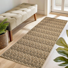 This is a nice, affordable 2x6” brown braided print rug. It’s made well. It feels great your feet, so every soft. It’s stain resistant and machine washable. The rug has a non slip backing so it stays in place. This rug looks great in craft room. I’m very pleased with the rug.