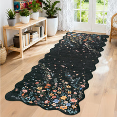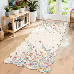 We got this affordable runner for our elderly dog so she doesn’t slip on the tile kitchen floor when she comes over to beg for food. The floral pattern looks really nice in person, and the curvy, scalloped edges give it a more decorative look than a plain rectangle. The size works well in front of our kitchen counters—long enough to cover the main traffic area without feeling oversized or getting in the way of doors.It’s not super thick, but it feels comfortable underfoot and lays flat so there’s no issue with the edges curling up. The grippy rubber backing keeps it from sliding around on the tile, which really helps our dog get traction when she’s standing up or walking through the kitchen. It’s also pretty easy to keep clean; regular vacuuming works fine, and crumbs or pet hair come up quickly without the rug shifting around. Overall, it’s a pretty, functional runner that adds some style while giving our dog’s older legs a safer surface to walk on.