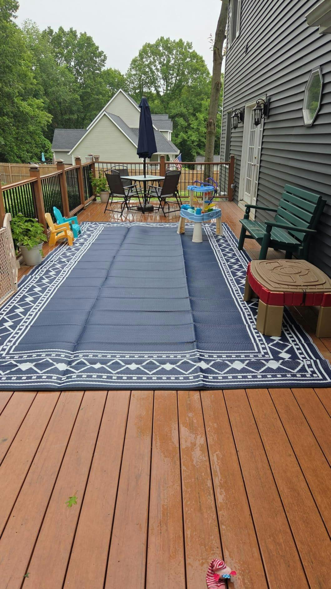 This rug turned out really great for our back porch! I was looking for the most cost effective way to cover a large portion since the deck boards get hot in the sun, and this was a great option! My husband even questioned how much I spent stating it looked more expensive than I had stated lol.