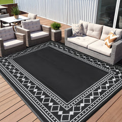 Garvee Large Outdoor Rug 9x12 Reversible Rug Waterproof Patio Rug Deck Rug, Geometric Outdoor Plastic Straw Rug, Uv Resistant Picnic Mat Camping Rug, Lightweight Outdoor Carpet, Black