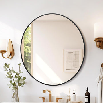 Transform your bathroom, vanity, or living room with our stunning 36-inch gold circle mirror. Featuring a sleek matte black metal frame, this eco-friendly mirror combines elegance with practicality for any modern home.
