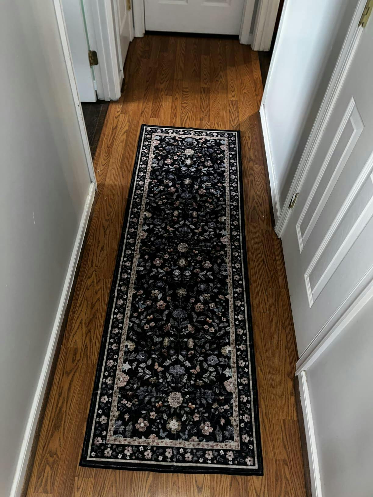 This rug goes really well with our golden oak hardwood floors. It’s nice to have such nice colors that look good without making everything look orange. Its nonslip backing is a bonus as with a dog running around as well as grandchildren it stays in place.