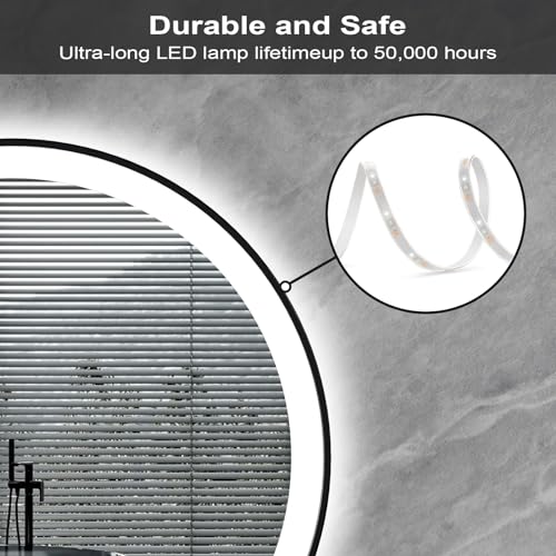 With its sleek black frame, dimmable lighting, and anti-fog technology, this mirror combines cutting-edge features with elegant design to elevate your bathroom experience.