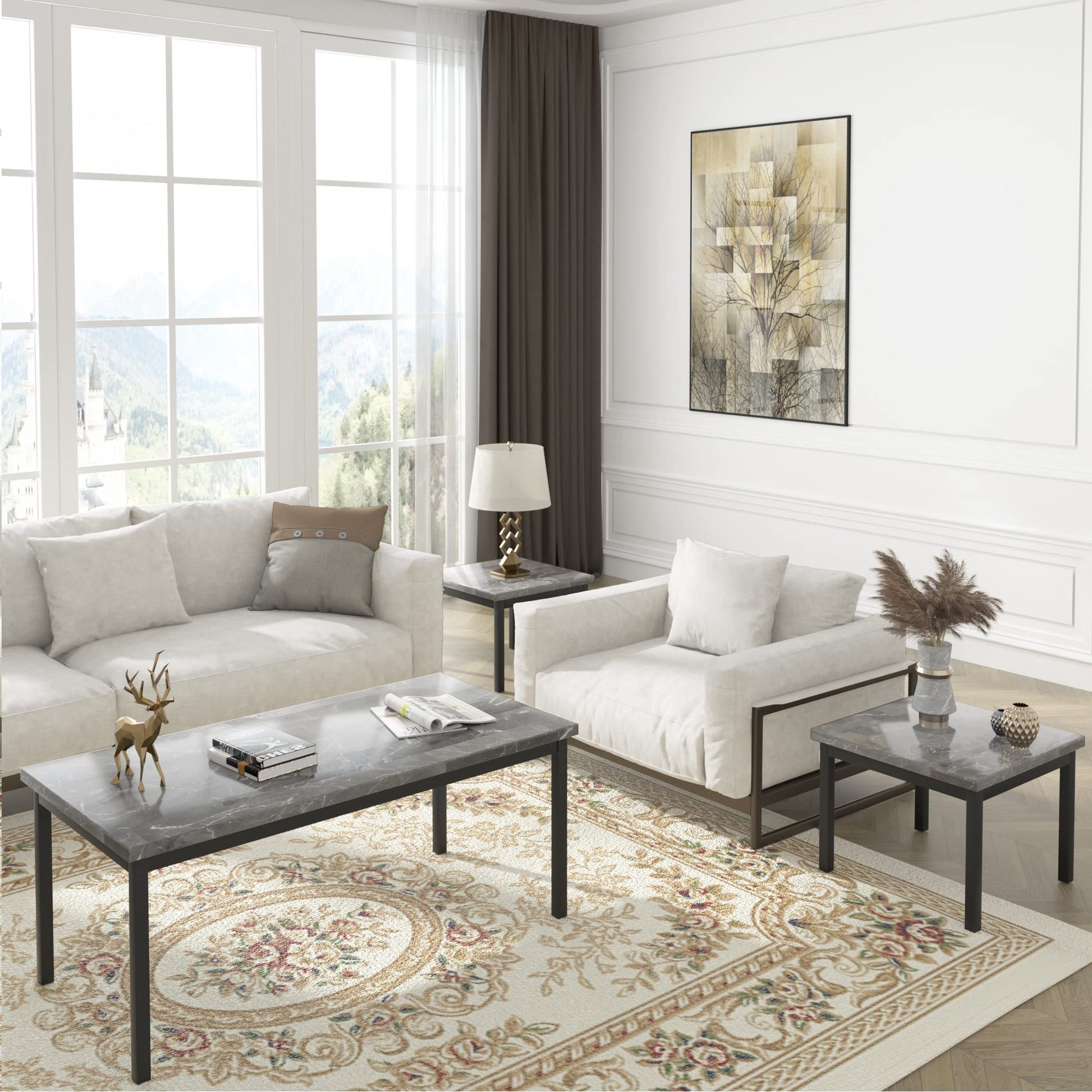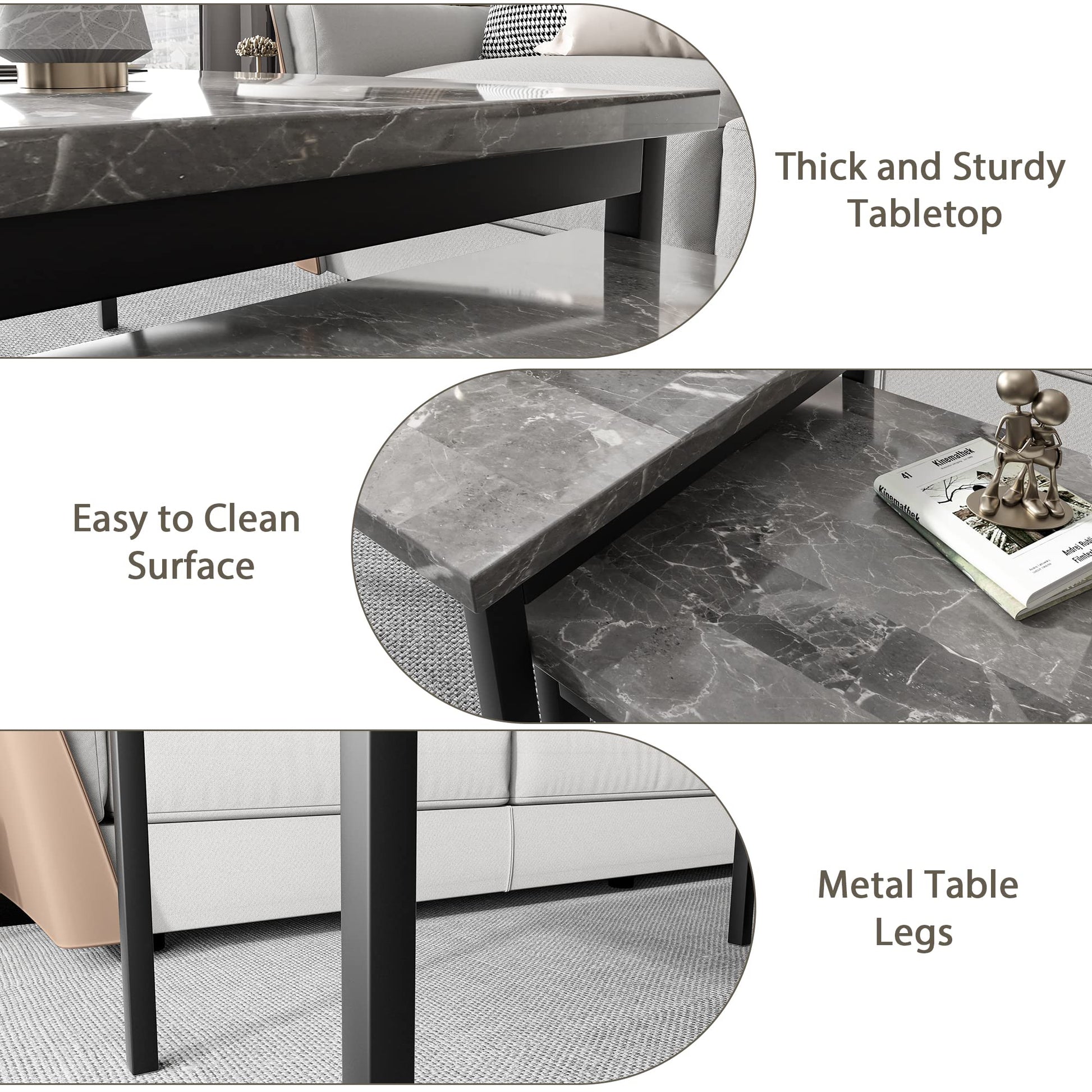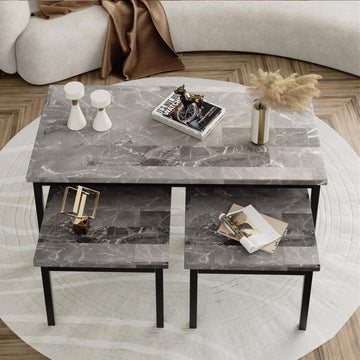 With its marble-inspired design, sturdy construction, and versatile configuration, this table set combines aesthetics with functionality. The perfect coffee table set of 3 pieces offers both style and practicality for your living space.