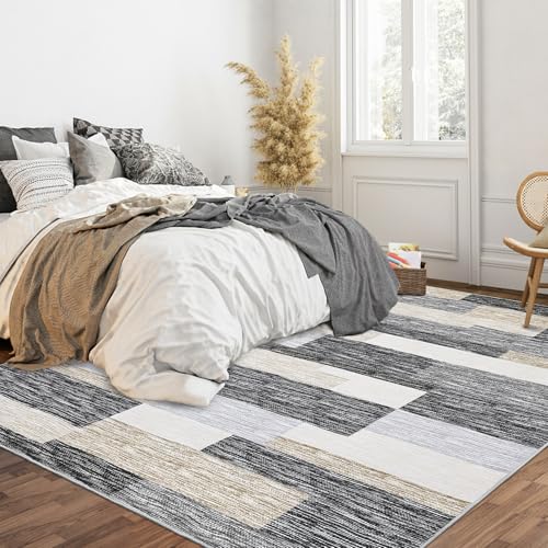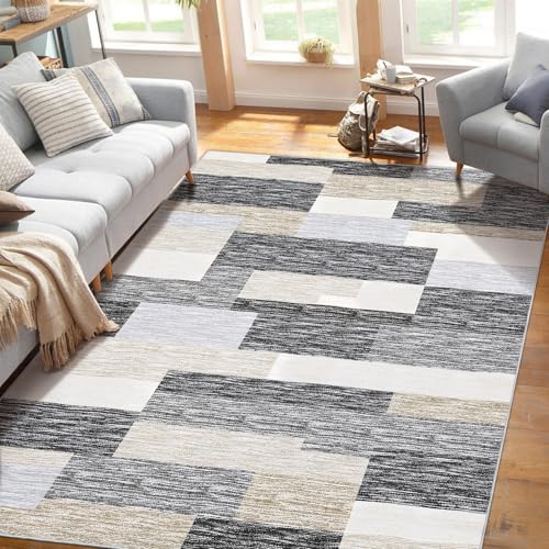 Garvee Machine Washable Living Room Rugs 8x10 Non-Slip Modern Geometric Floor Carpet, Stain-Resistant Low Pile Throw Rug, Contemporary Accent Rug for Kitchen, Office, Gray Camel