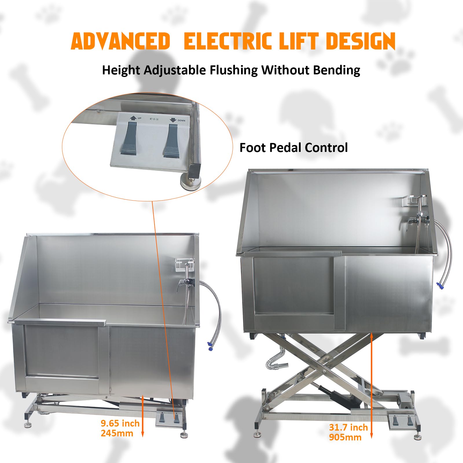 - Adjustable Height: The adjustable height of this pet bathtub is 9.65 inches-31.7 inches. Just step on the pedal to easily adjust the pet bathtub to the ideal height. This innovative design allows you to bathe your pet without bending over for a long time, making the experience more comfortable and convenient.