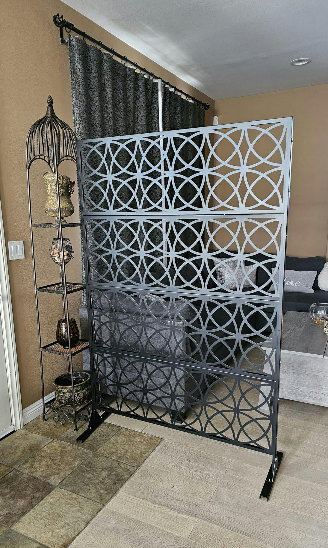 This metal room partition is really classy looking. It instantly upgraded my space with the patterned art design. The frame was fairly easy to assemble with the provided nuts and bolts. The metal panels are lightweight and easy to carry. It stands just under 6 ft tall. Loving this modern look.