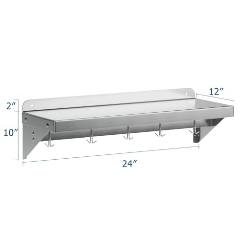 Garvee 2 Pack Stainless Steel Shelf 12x24 Inches,180LBS Multifunctional Metal Wall Mounted Shelf with 2 Stainless Steel Backsplashs and 5 Hooks