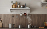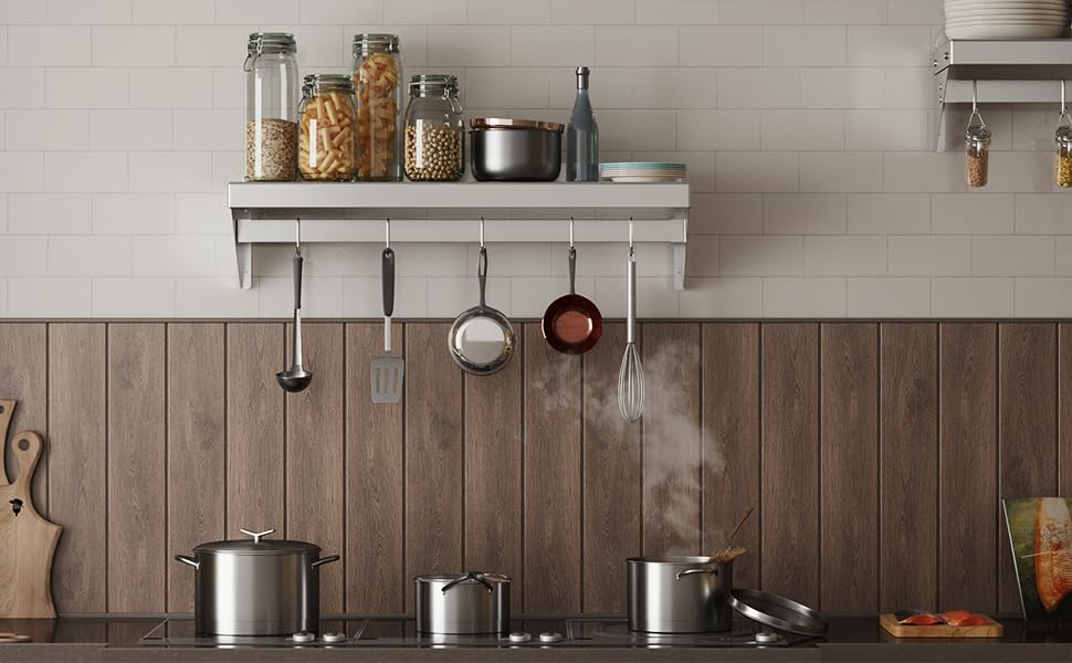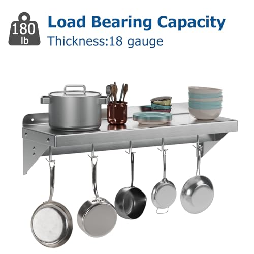 - 【High Load capacity】:The stainless steel shelf with 5 hooks is 180LBS for greater load capacity and can be used as a kitchen shelf to hold pots,frying pans and other kitchen equipments.