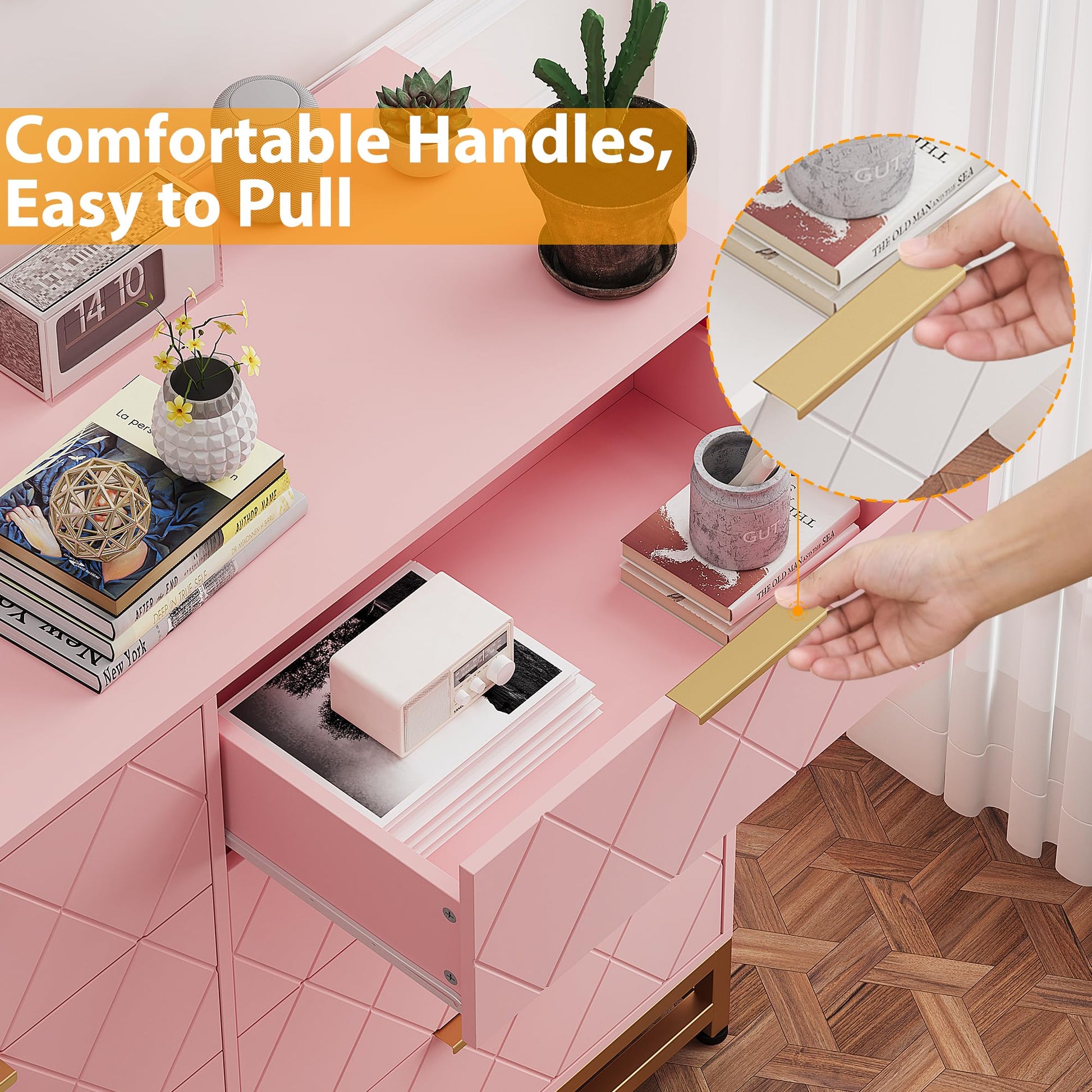Sleek gold metal legs and knobs add a touch of luxury to this pink dresser, making it a standout piece in any room.