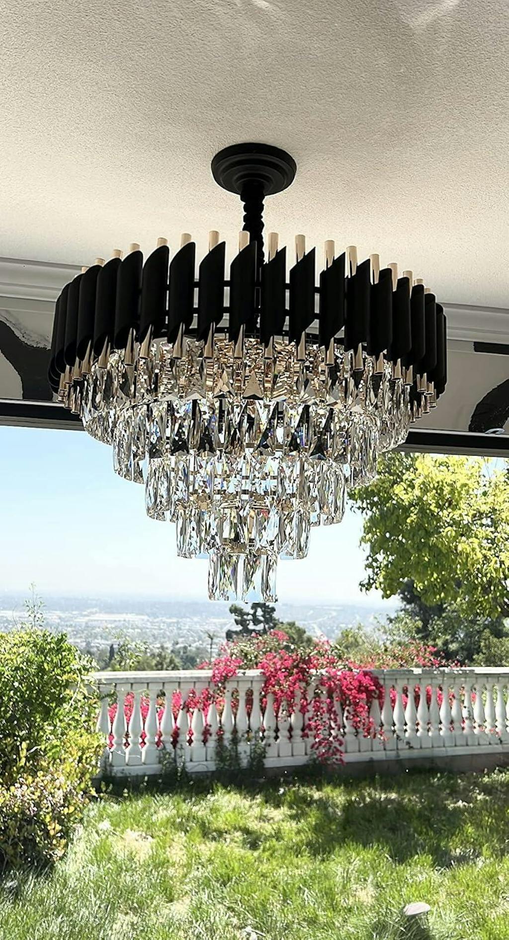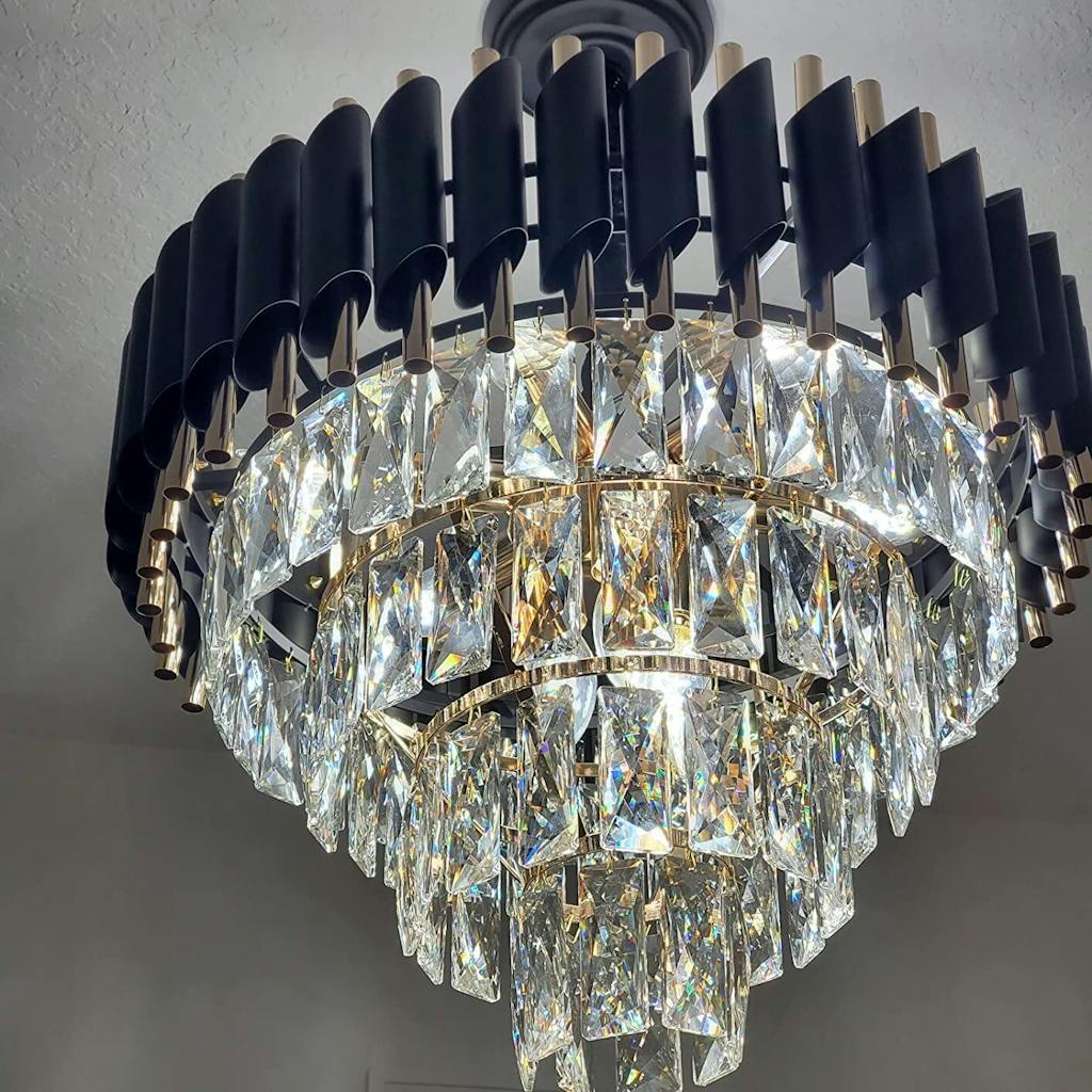 - 【Black Crystal Chandelier】This round crystal chandelier is 4 Tiers 7 lights design ,covered with different layers of K9 crystals combined with golden&black mental frame, to create a very elegant and luxury look at your home.4-Tiers sparkling crystal chandelier lighting with contemporary design, perfect for home decor which will make your house look stunning.