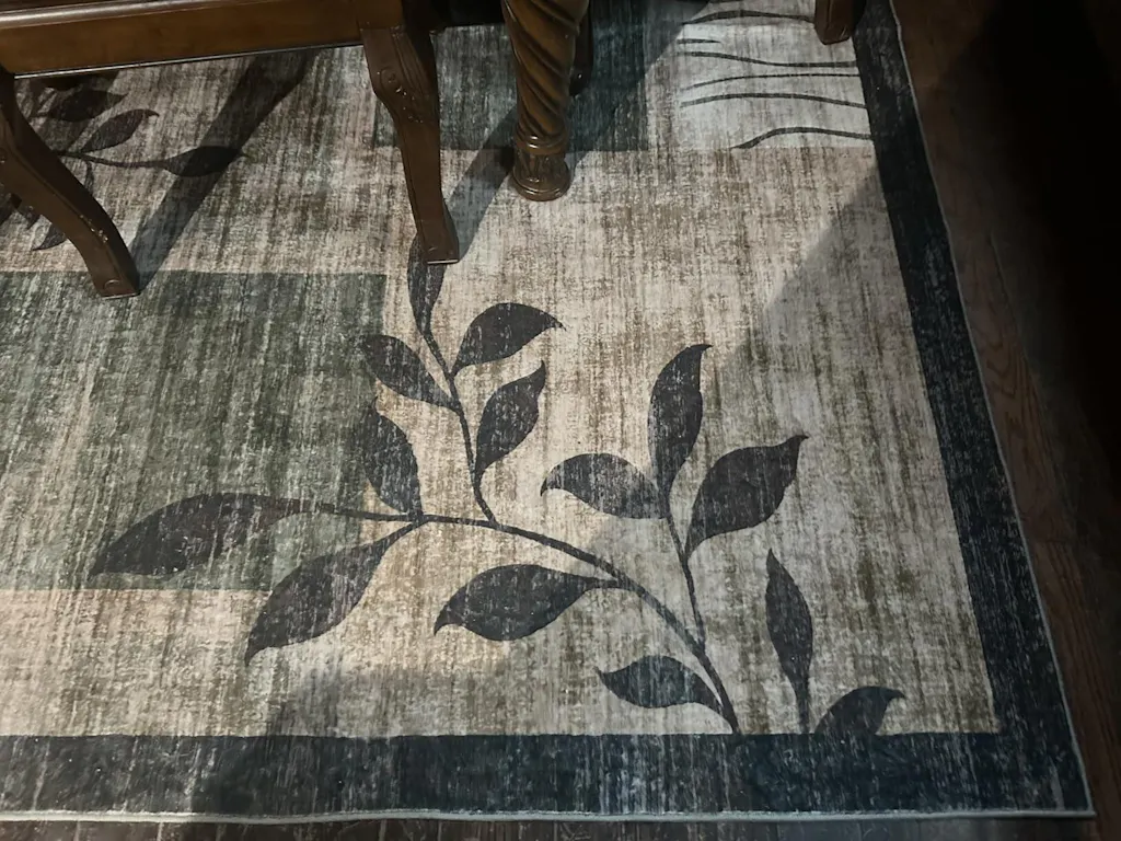 This is a very solid rug, and I could not be any happier with it. Very neutral colors and designs within the rug which means any style furniture will work with it. I noticed immediately the material the rug is made out of is very durable and has a nice thickness so it will take a lot to beat this rug up. The value for the money goes I don’t think you can find any place where you can get this kind of rug this cheap of a price. So far we have not had to clean it but because it is a darker shade of colors in the rug I don’t think stains and marks from whatever is brought inside the house from the outside are as visible as it would be with a lighter colored rug. I would highly recommend this rug for any dining room or living room.